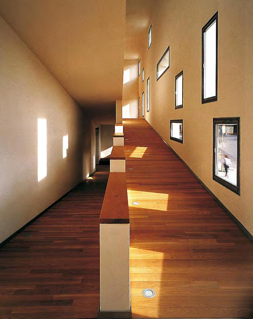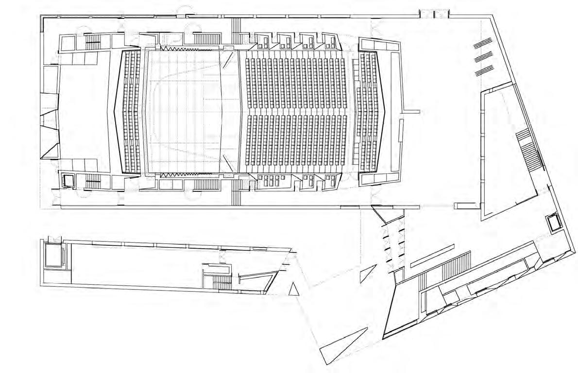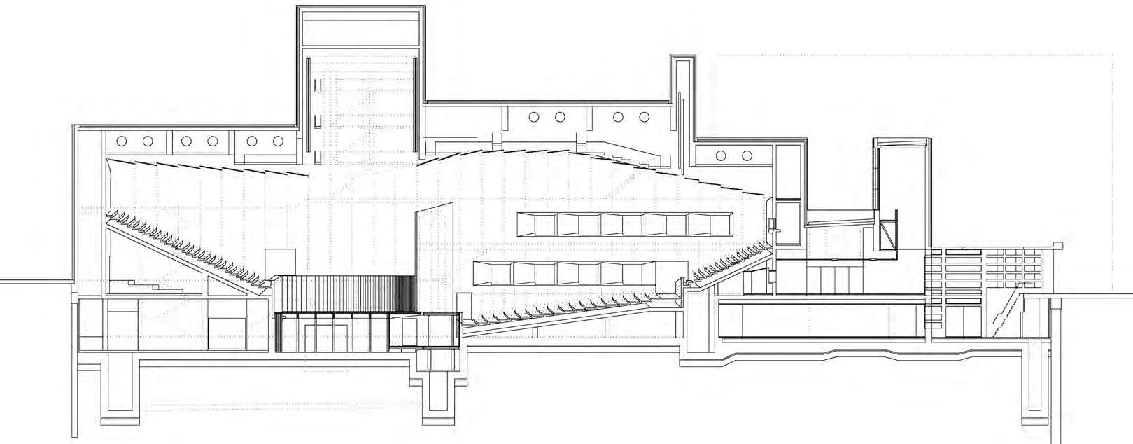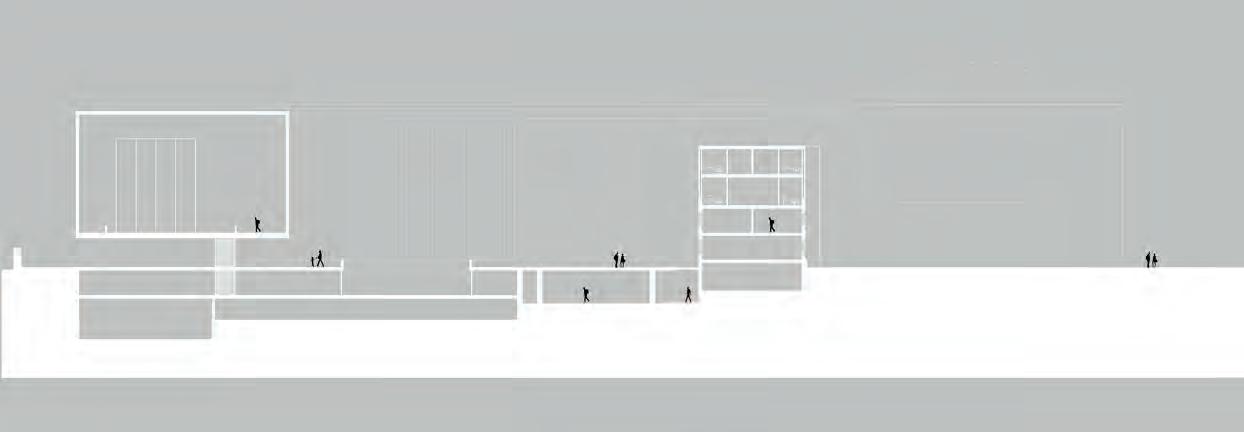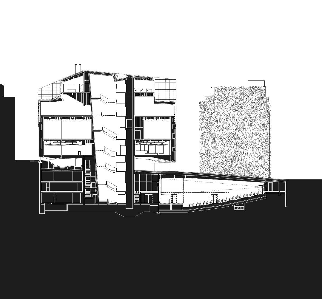 There is corner cut on an angle providing outdoor space and daylight to flood into the basement floor. This is the most public of floors as the basement, which is partially underground and partially above ground because of the topography, houses the gallery and exhibition space for the public, along with a lecture hall to accommodate for public lecture series.