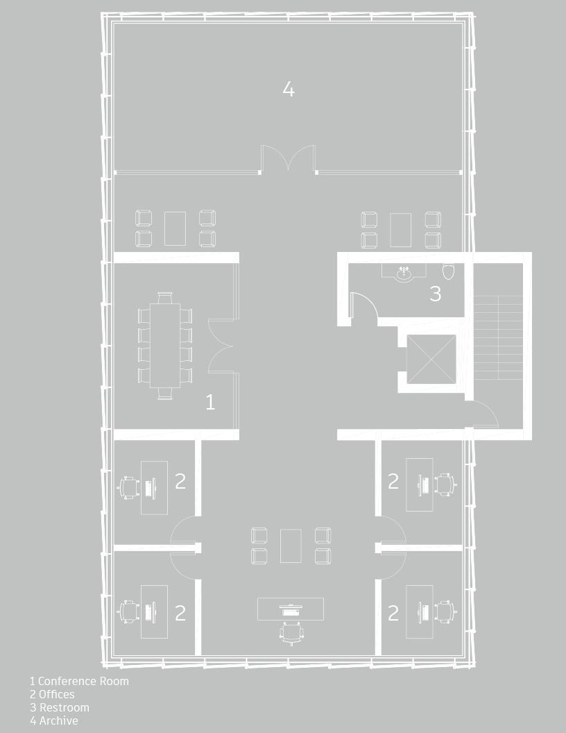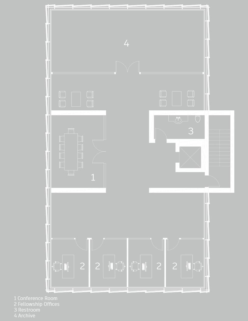 The floor plan above shows level 3 which will be the most private of spaces which are offices for the professors, and directors who will be pursuing this topic for further research. There is a north and south conference rooms.