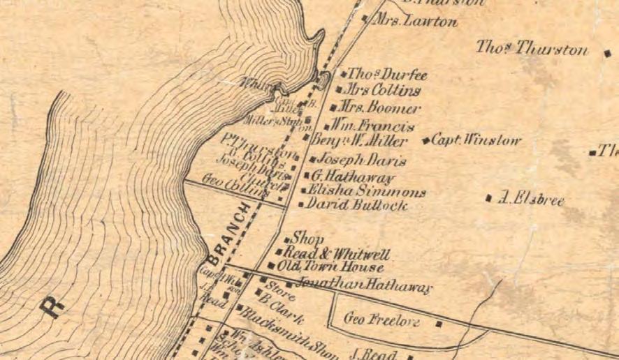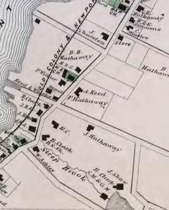 Over the course of the mid to late nineteenth century, Steep Brook continued to be a modest village center with small-scale industry, agriculture, and commerce (Figure 2) Every major farm reputedly had a wharf, or wharf access on the Taunton River, and later, access to the railroad. Steep Brook offered the “Green Dragon Inn,” opened by Orin Eddy in the mid1800s, Barnabas Clark’s blacksmith shop, and a wharf built by Job T. Wilson at the end of Wilson Road, where trade ships were constructed and local shipping trade occurred (Figure 3) 9