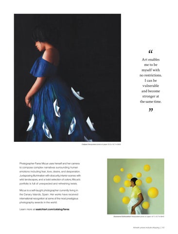 Photographer Fares Micue uses herself and her camera to compose complex narratives surrounding human emotions including fear, love, desire, and desperation. Juxtaposing illumination with obscurity, interior scenes with wild landscapes, and a bold selection of colors, Micue’s portfolio is full of unexpected and refreshing twists. Micue is a self-taught photographer currently living in the Canary Islands, Spain. Her works have received international recognition at some of the most prestigious photography awards in the world. Learn more at saatchiart.com/catalog/fares Excessive Estimulation Manipulated photo on paper 19.7 x 19.7 in $640
