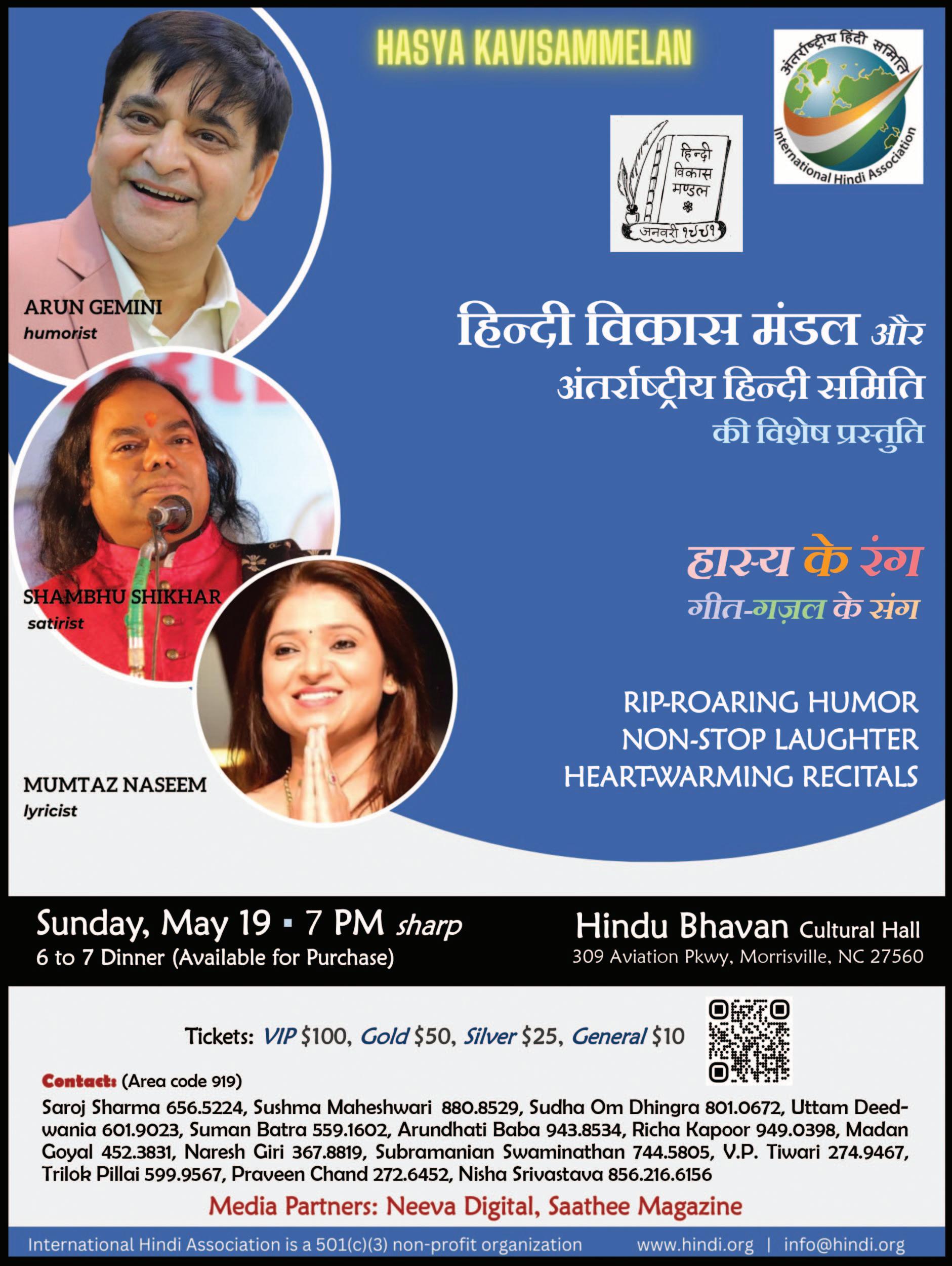 Hindi Vikas Mandal along with the International Hindi Association present the humorous and heartwarming Hindi recitals from Arun Gemini, Shambhu Shikhar, and Mumtaz Naseem on Sunday, May 19, 2024 beginning at 7pm at Hindu Bhavan Cultural Hall, 309 Aviation Parkway, Morrisville, NC. Dinner will be available for purchase from 6 - 7pm. For more details, call 919-656-5224 or 919-880-8529. Visit Hindi.org.