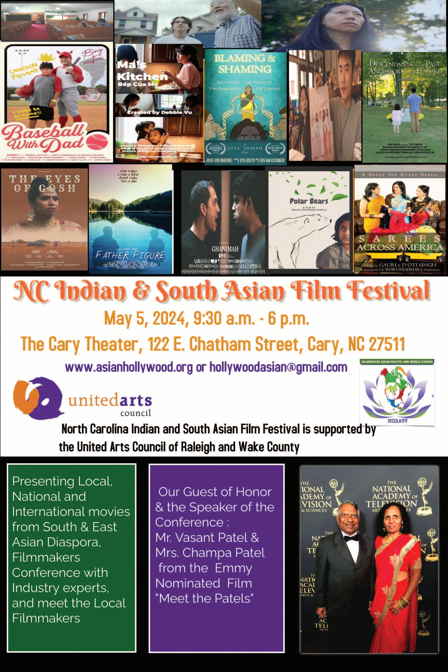 The 9th Annual NC Indian and South Asian Film Festival dedicated to the films of South & East Asian Diaspora returns on May 5, 2024. A variety of fiction and nonfiction movies from national and international filmmakers will be screened, along with movies and appearances by local filmmakers, and South & East Asian Filmmakers Conference with industry experts, guests of honor, Vasant and Champa Patel, from the Emmy Nominated - Meet the Patels. For a full list of films, to purchase tickets, and other details, visit Asianhollywood.org.