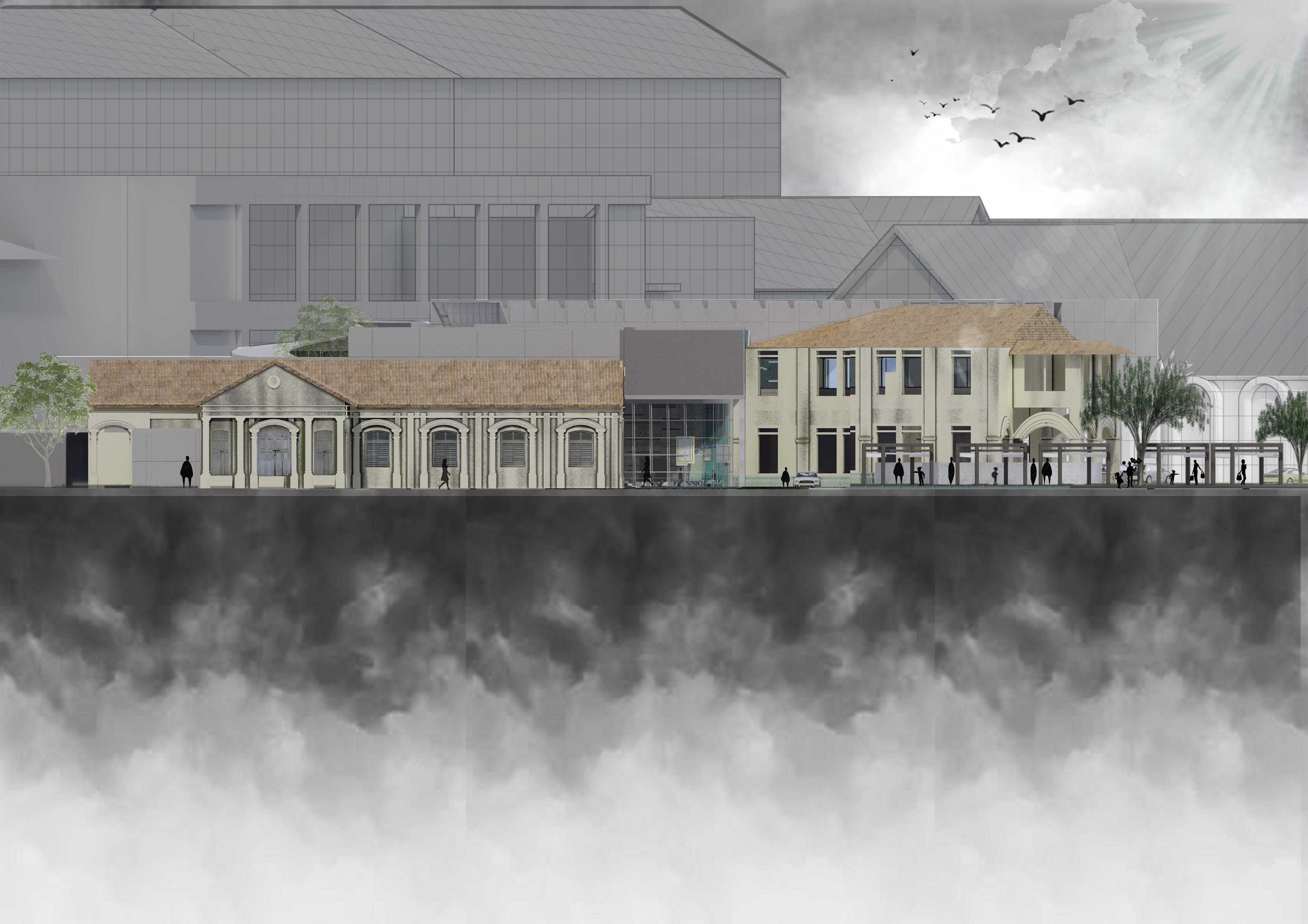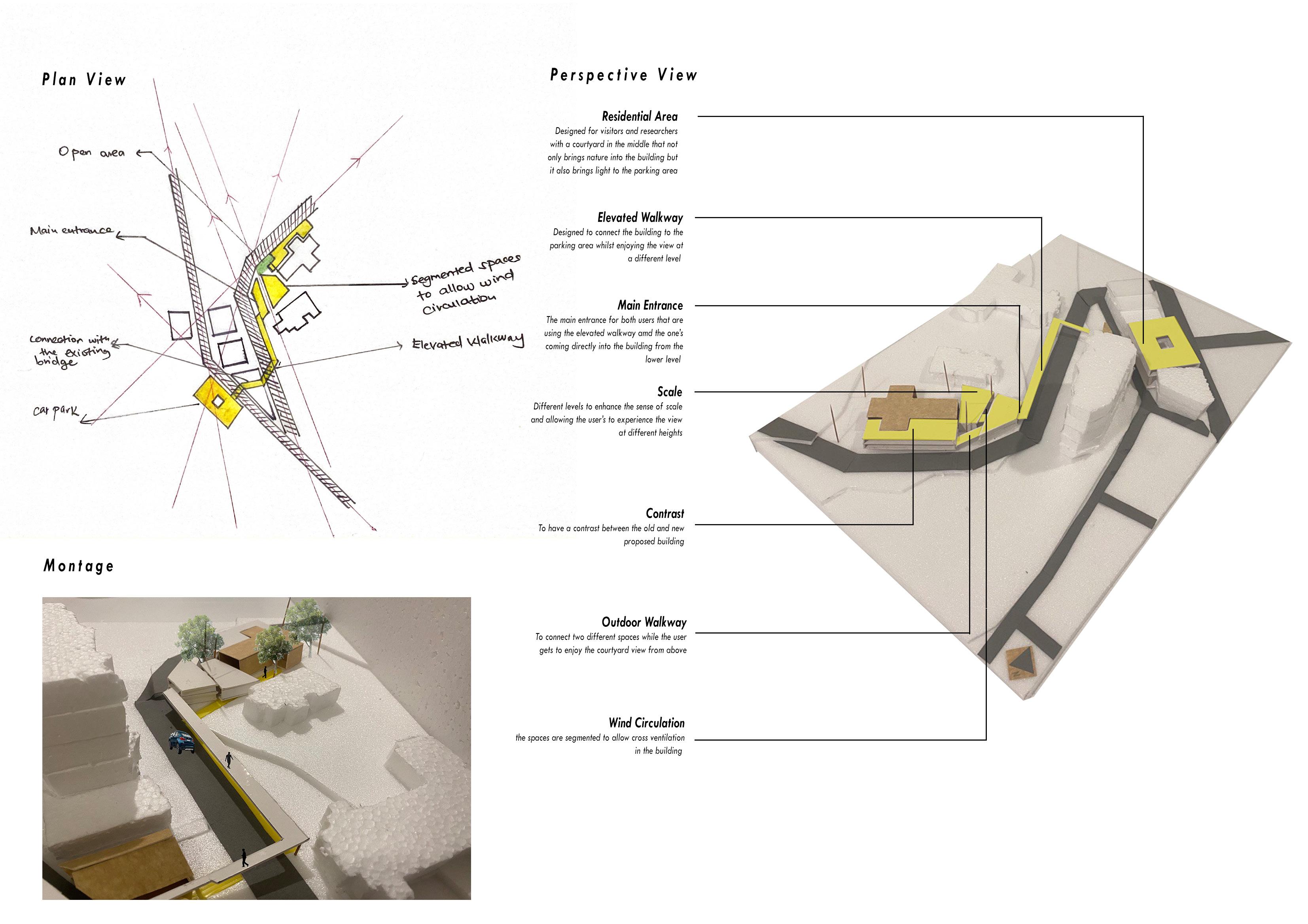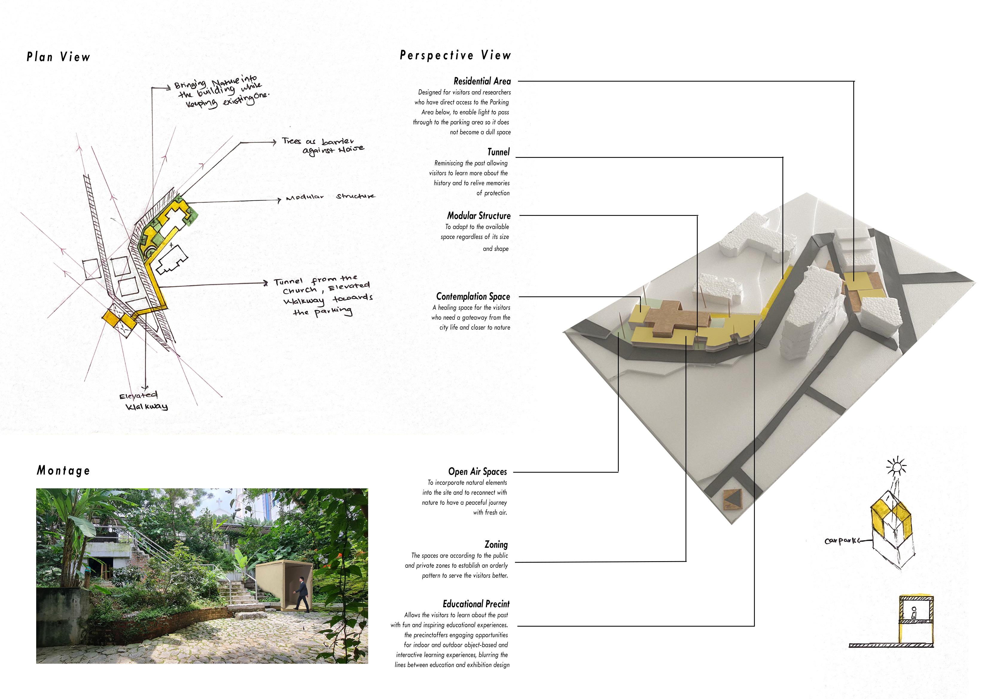 The collage on the left shows the reflection of the old church in Bukit Nanas. In the past, the building was made of Timber and it burnt down hence they used bricks to reconstruct it. It shows the church in form of the burnt wood while the bottom part is memories filled which are to be uncovered while the top shows growth which means new memories are created. Like how the Church turned into a clinic , then into a community service centre and finally abandoned.