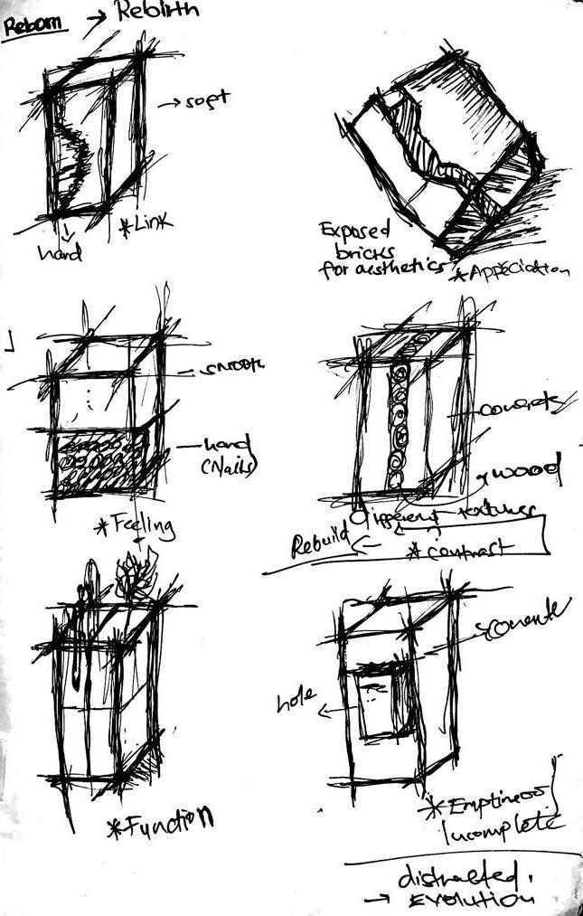This sketches show the idea of Rebirth How the materiality, function and space is used to make a building vibrant and useful