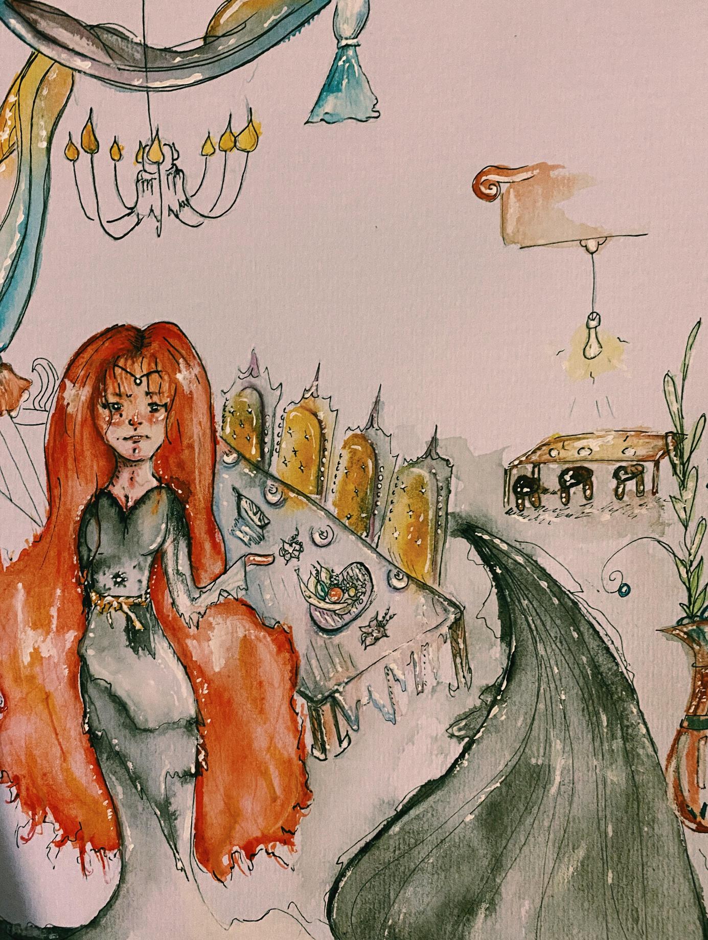 E então surgiu uma bela mulher, com os seus cabelos vermelhos cor de chamas, longos e ondulados, um olhar intimidador que fazia arrepiar, e vestia um belo vestido negro.