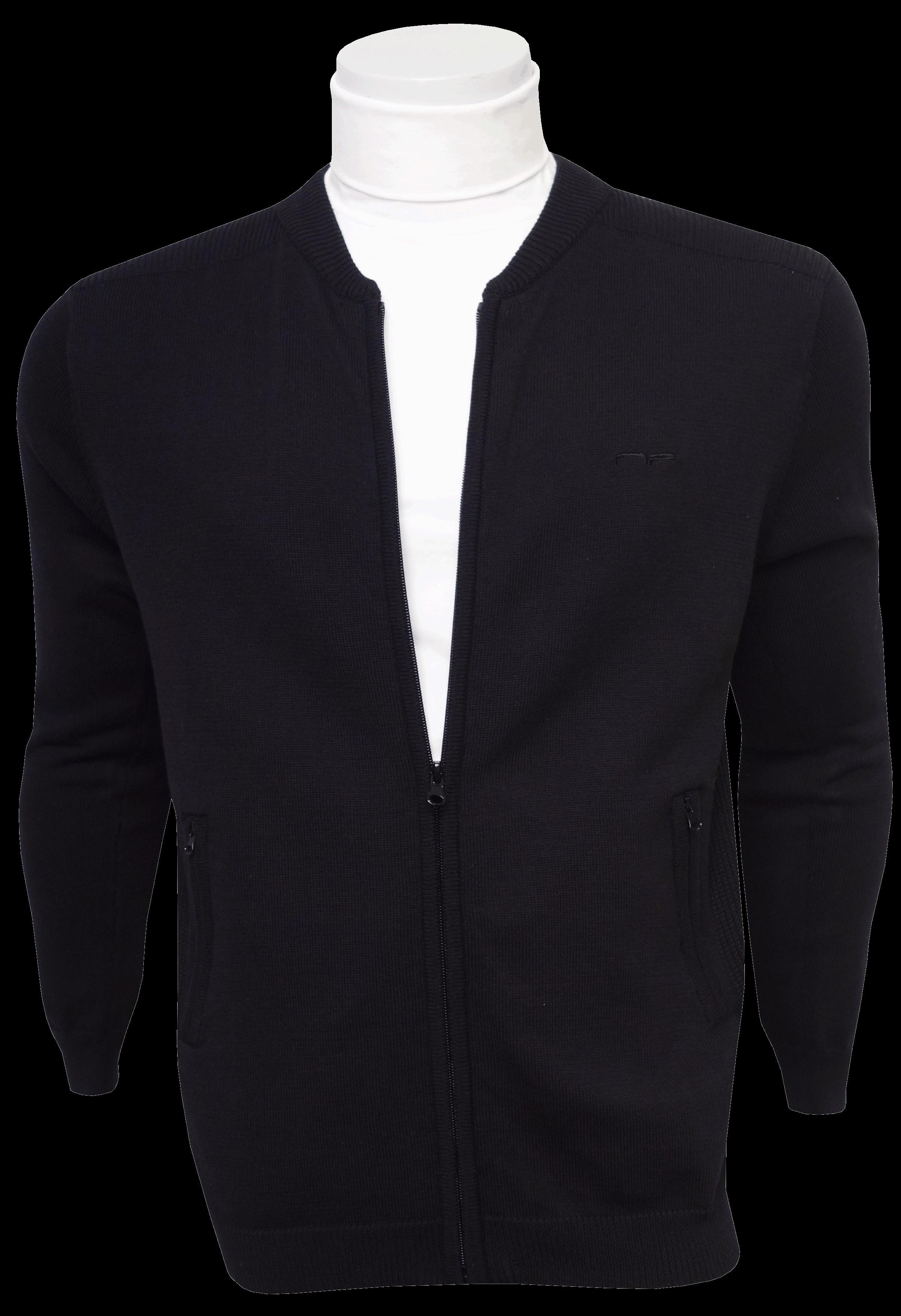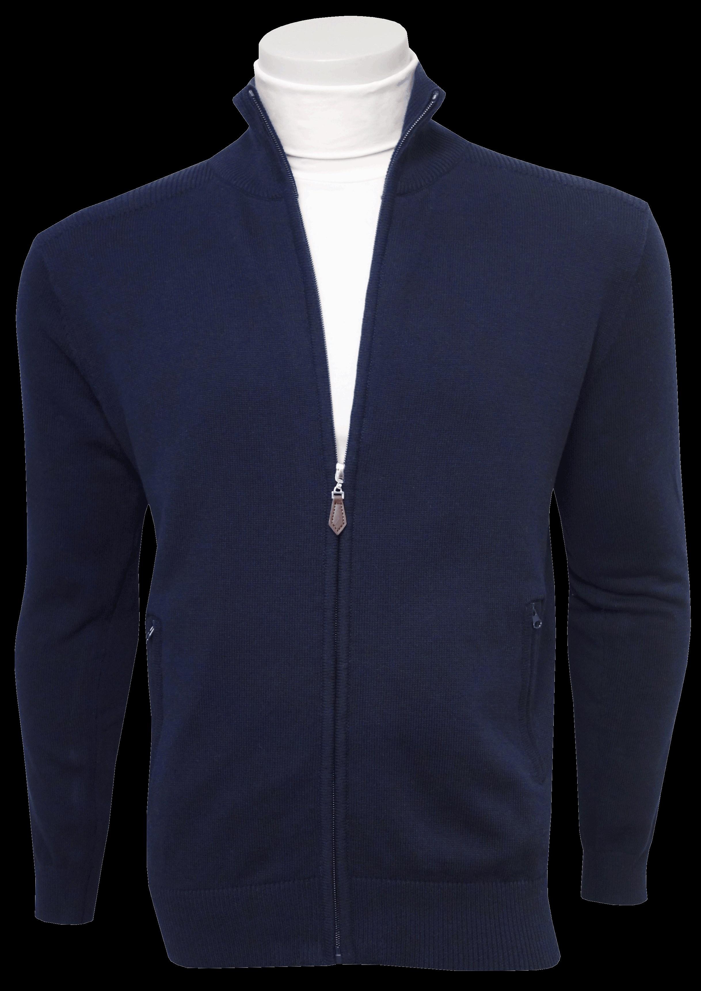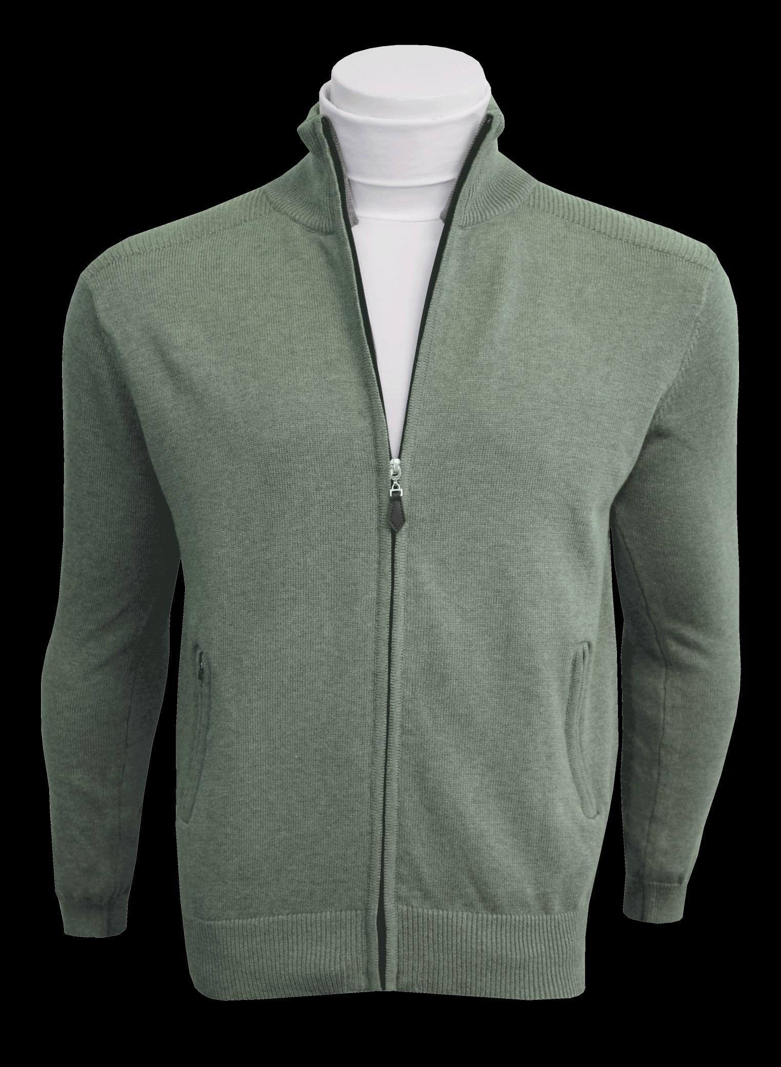 Slätstickad cardigan med ribbstickat axelparti och krage, samt hög krage. Sidfickor med dragkedja. 100% kammat bomullsgarn.