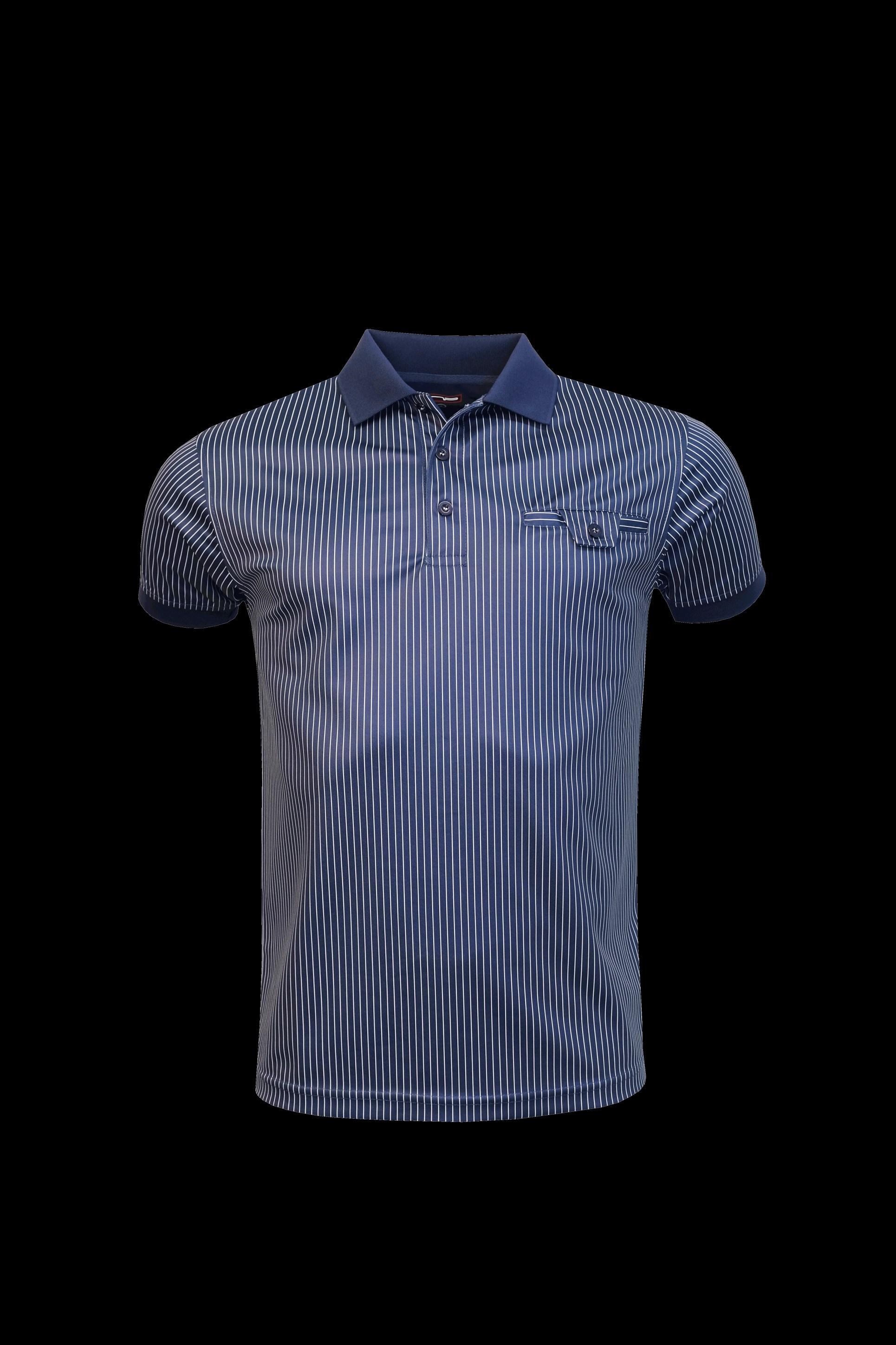 Piké med infälld bröstficka i vårt tekniska lucoolmaterial med streckmönster. Ribbstickad krage och ärmmudd.