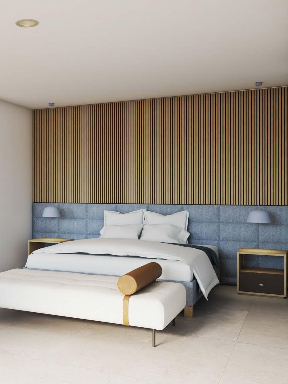 Both rooms in the hotel project showcase a harmonious blend of light blue tones with warmer colours such as brown leather and beige, creating a soothing and inviting environment for guests to enjoy during their stay. The carefully chosen materials add a touch of luxury and elegance to the rooms, providing a memorable experience for guests seeking comfort and sophistication.