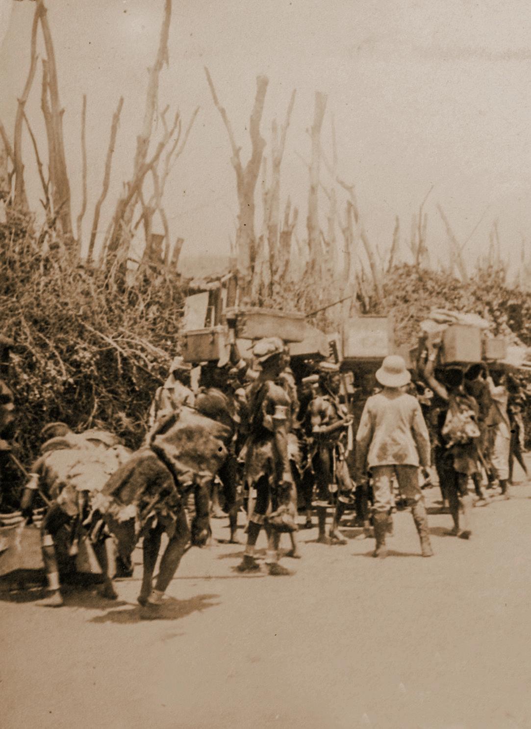 Die rassistische Ordnung der Expedition zeigt die Fotografie oben und im Hintergrund. Darauf steht ein weißer Reisender im Vordergrund und befehligt eine beladene Gruppe von Trägern, wobei er sie anzutreiben scheint.