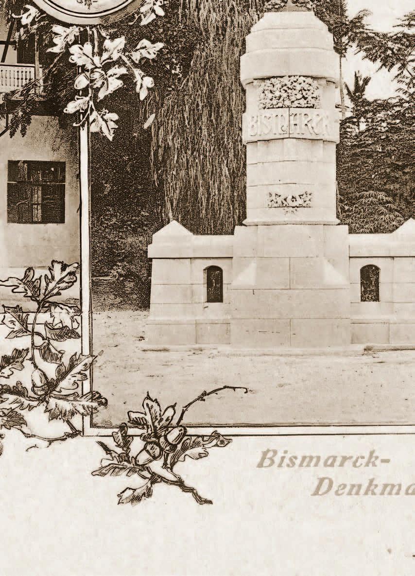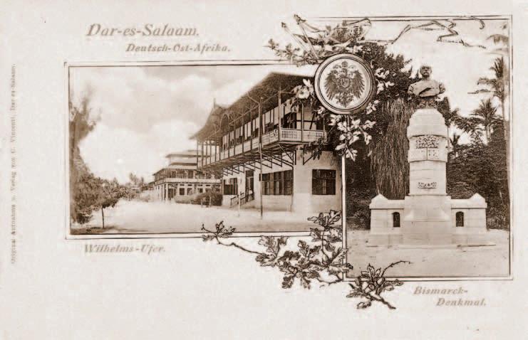 Im Hintergrund und auf Seite 11 ist oben eine Postkarte zu sehen, die Orte mit deutschen Namen in Daressalam zeigt, der heutigen Hauptstadt Tansanias. Indem Straßen und Plätze deutsche Namen erhielten und deutsche Denkmäler aufgestellt wurden, sollte der Machtanspruch des Kaiserreichs auf die damalige Kolonie Deutsch-Ostafrika verdeutlicht werden.