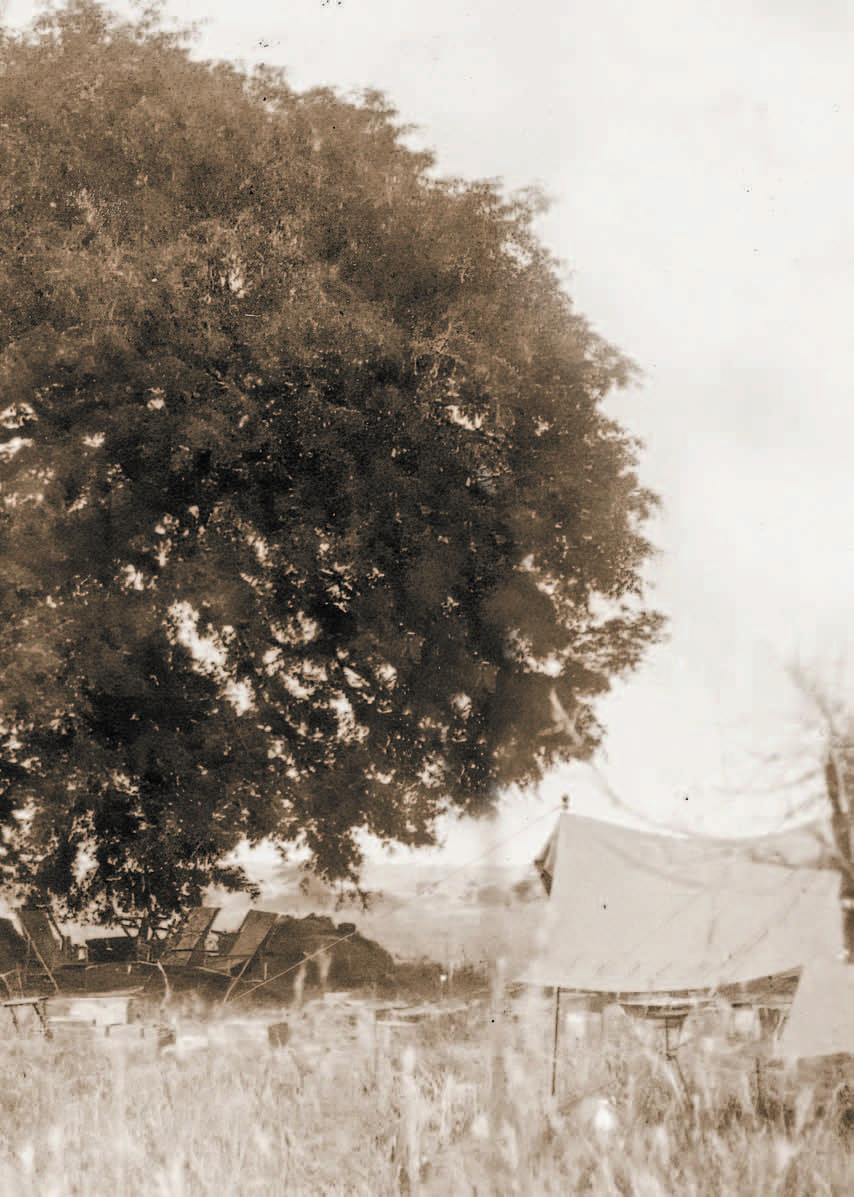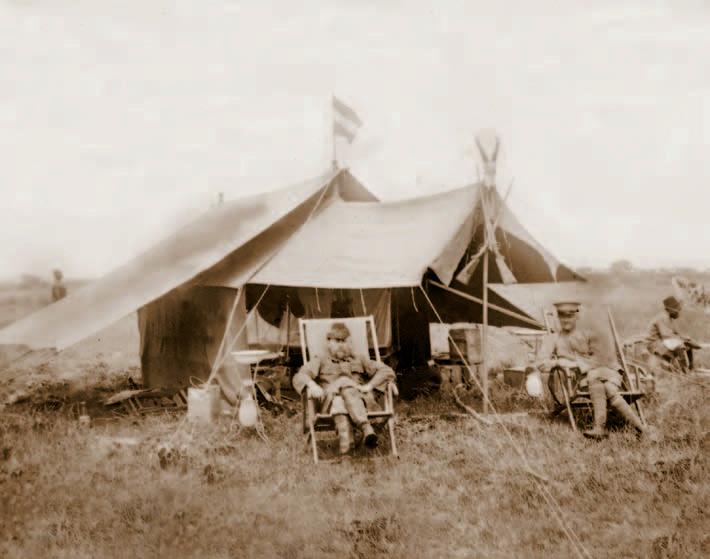 Auf dem Foto oben sind zwei weiße Männer zu sehen, die in Liegestühlen in einer demonstrativ herrschaftlichen Pose vor einem großen Zelt sitzen. Über dem Zelt weht eine Fahne, vermutlich die Flagge des Deutschen Reichs. Dieses Bildmotiv symbolisiert damit den deutschen Machtanspruch in Afrika. Die Flagge einer Nation in einem anderen Land zu hissen hat immer eine symbolische Bedeutung und war besonders in den Kolonien eine Machtdemonstration. Auch die Art, wie die beiden Reisenden im Bildvordergrund sitzen, soll Macht symbolisieren. Während sie im Zentrum des Bildes sitzen, sind im Hintergrund Afrikaner zu sehen, die arbeiten. Die Fotografie sagt damit aus, dass weiße Europäer*innen in den Kolonien herrschten und Afrikaner*innen für sie arbeiteten.