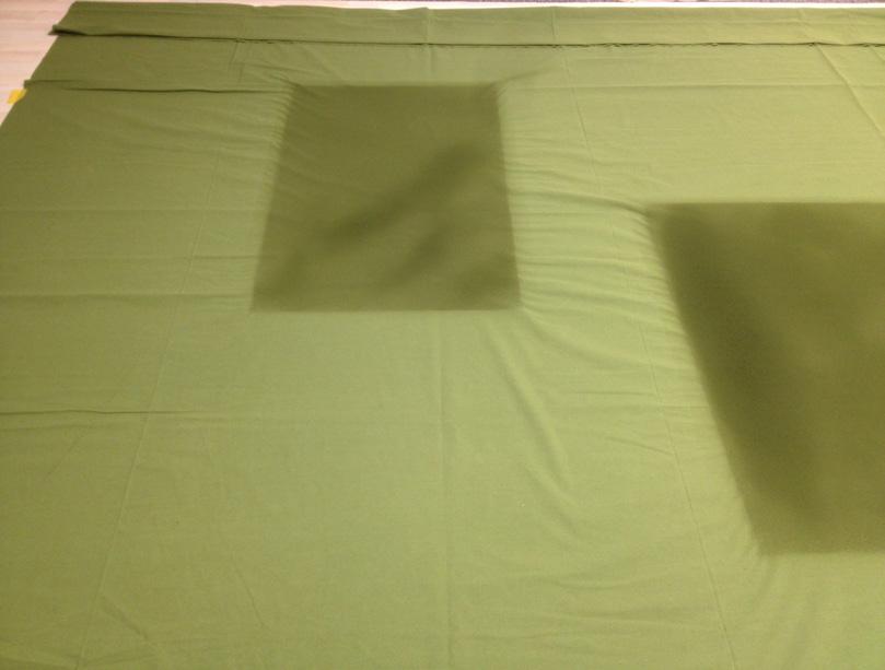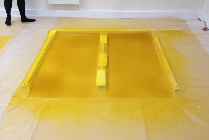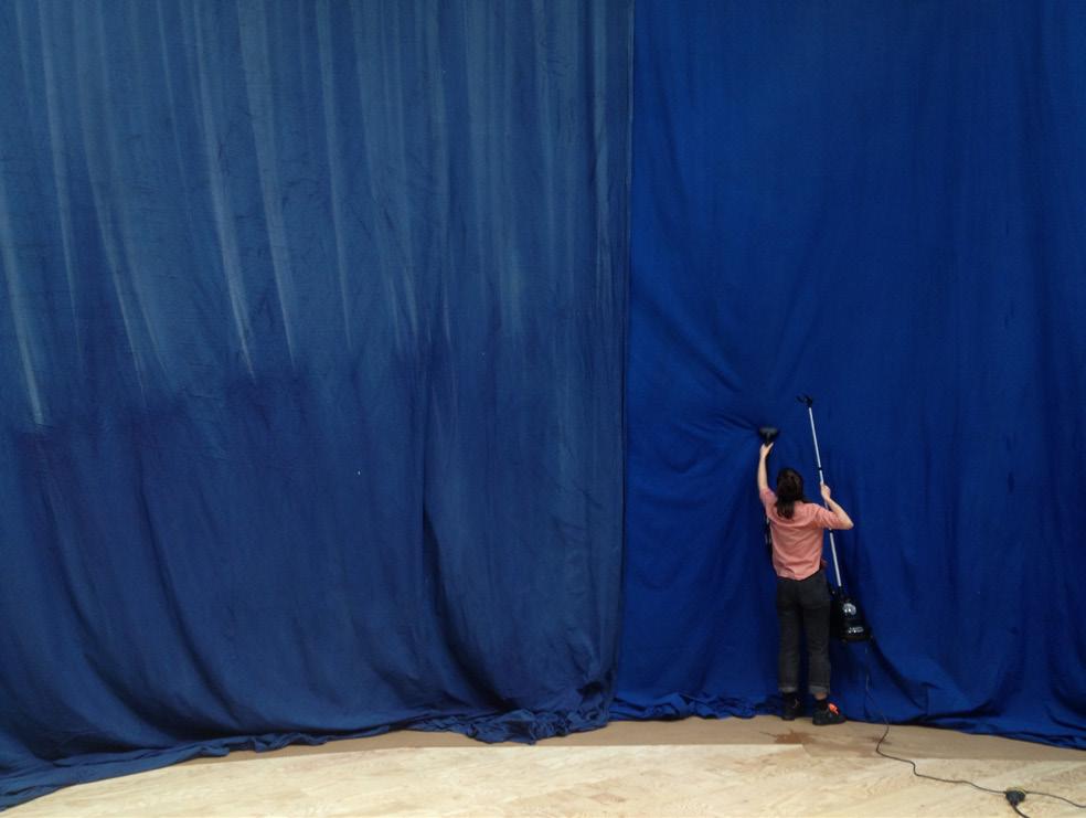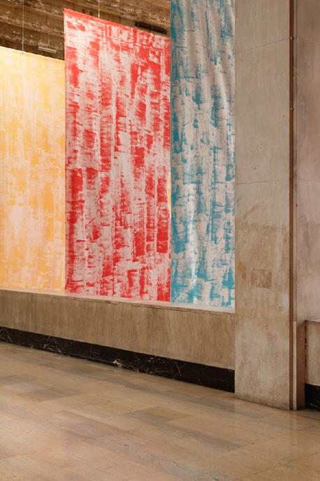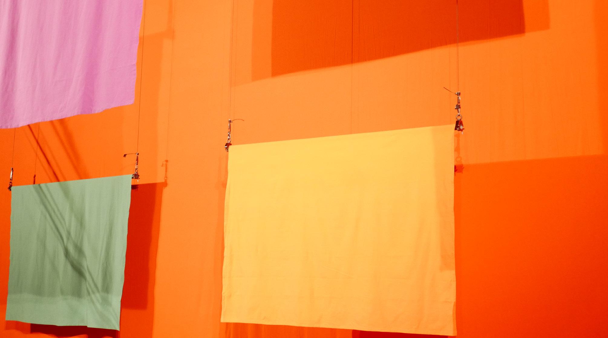 Conception et réalisation d’une série de rideaux décolorés en atelier et d’objets (11 x 6 m) pour une exposition / Production du film 16 mm C, Ü, I, T, H, E, A, K, O, G, N, B, D, F, R, M, P, L