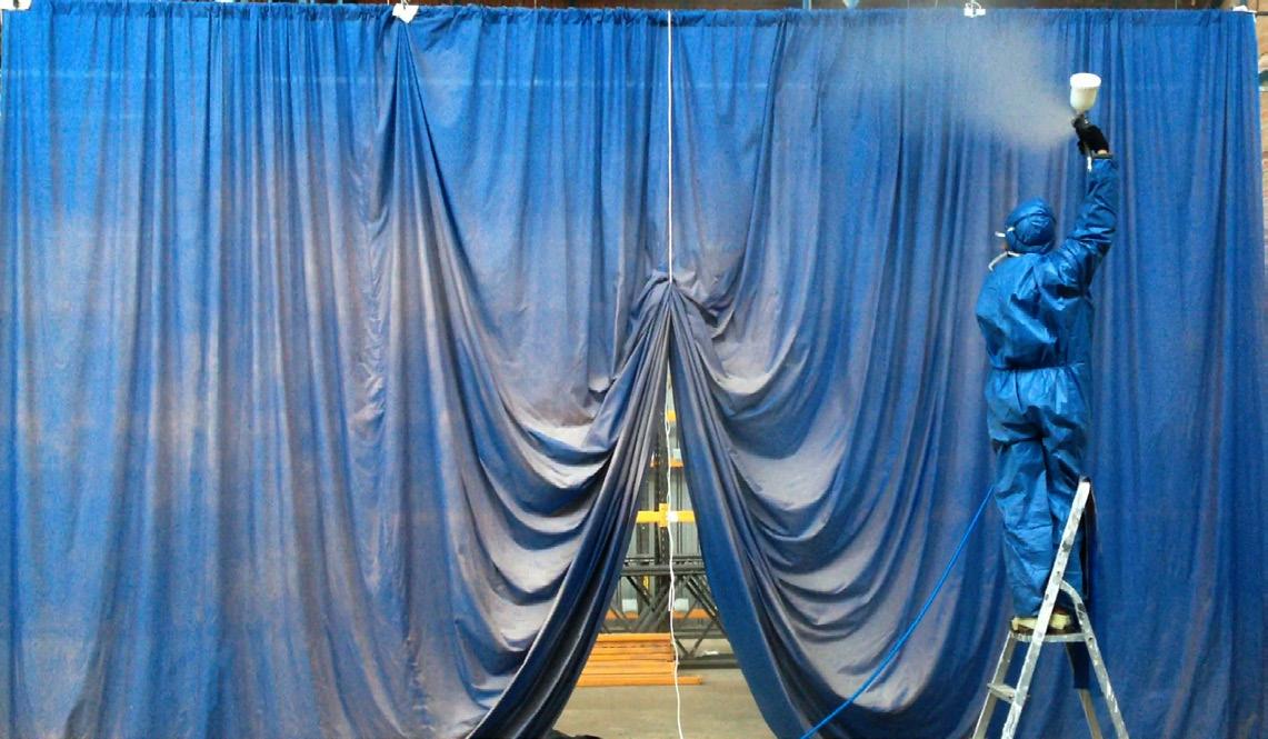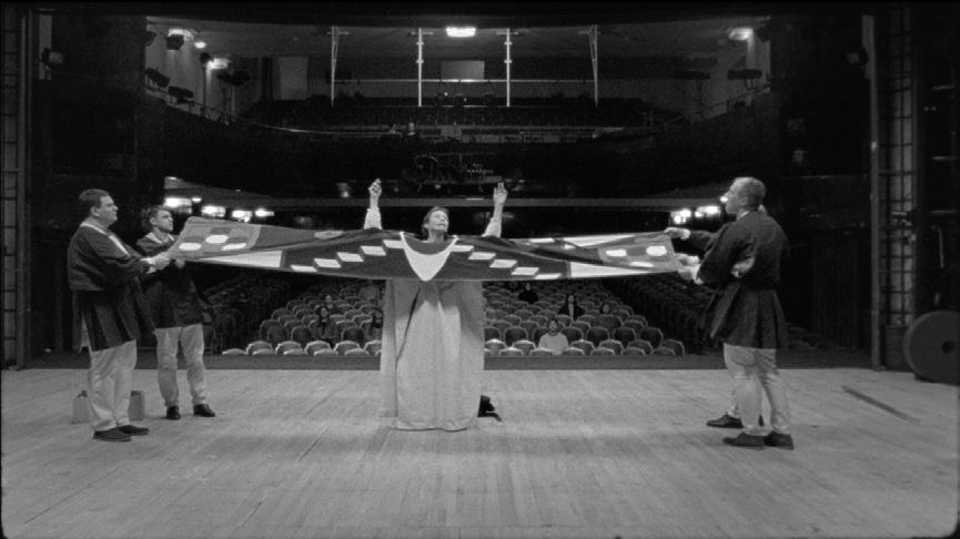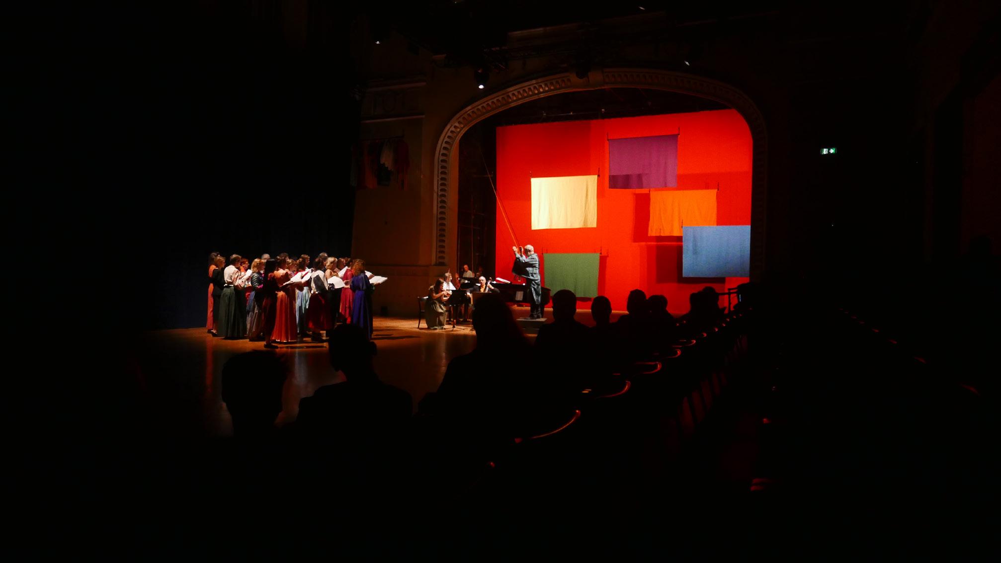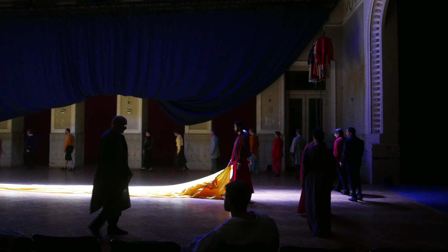 Aménagement du théâtre de Bussang pour le tournage du film 16 mm Le Milieu est bleu, accessoirisation et petits décors de tissu, teinture des costumes des acteurs et du choeur, habillage des acteurs, régie de transport