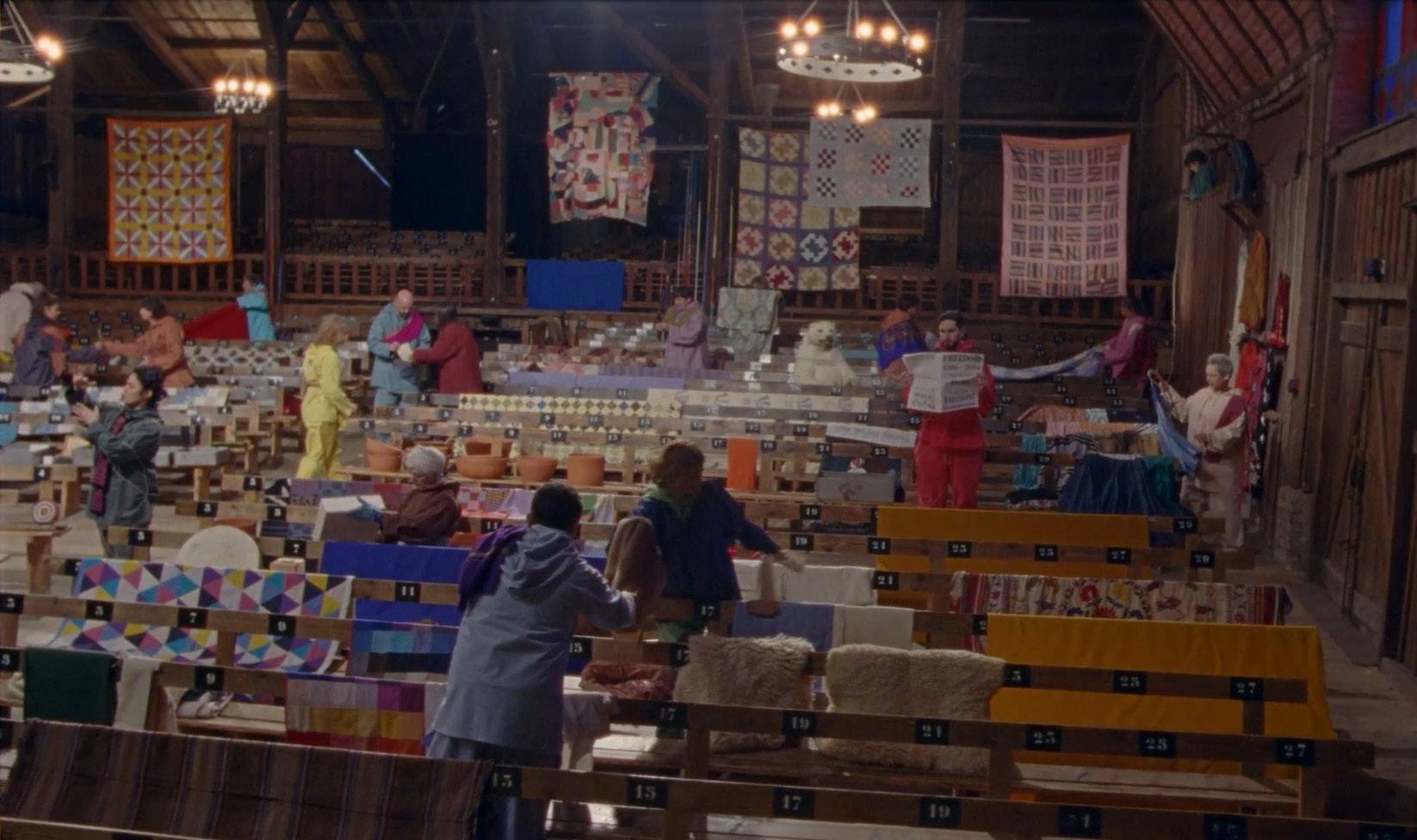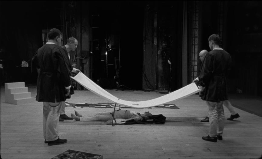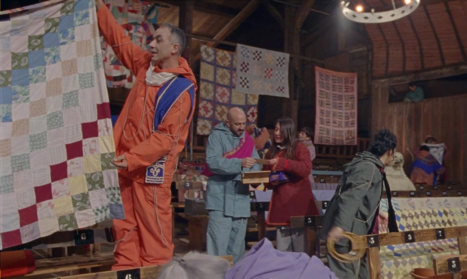 Aménagement du théâtre de Bussang pour le tournage du film 16 mm Le Milieu est bleu, accessoirisation et petits décors de tissu, teinture des costumes des acteurs et du choeur, habillage des acteurs, régie de transport