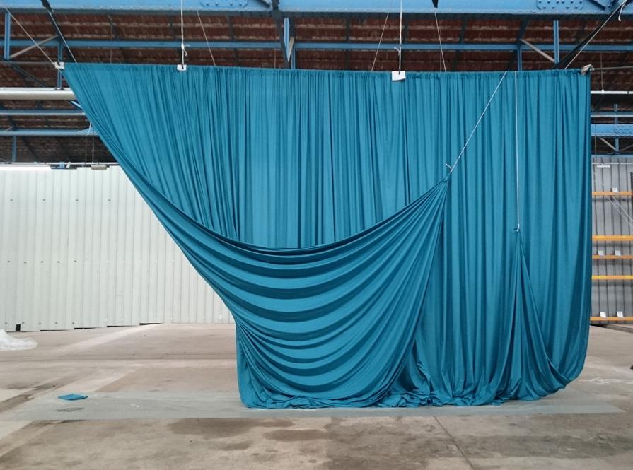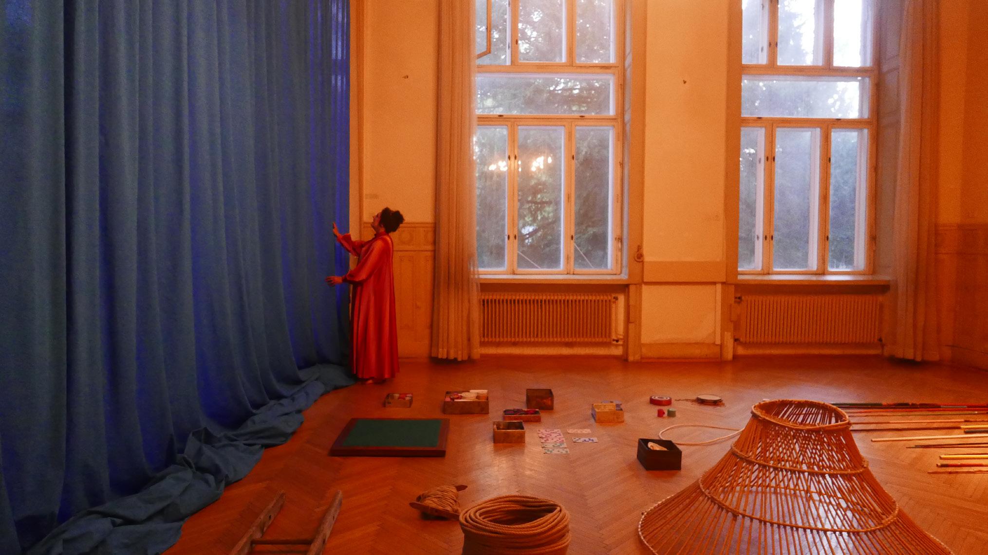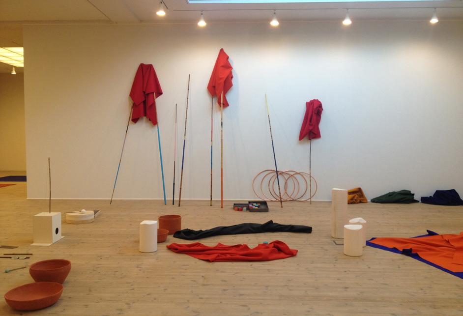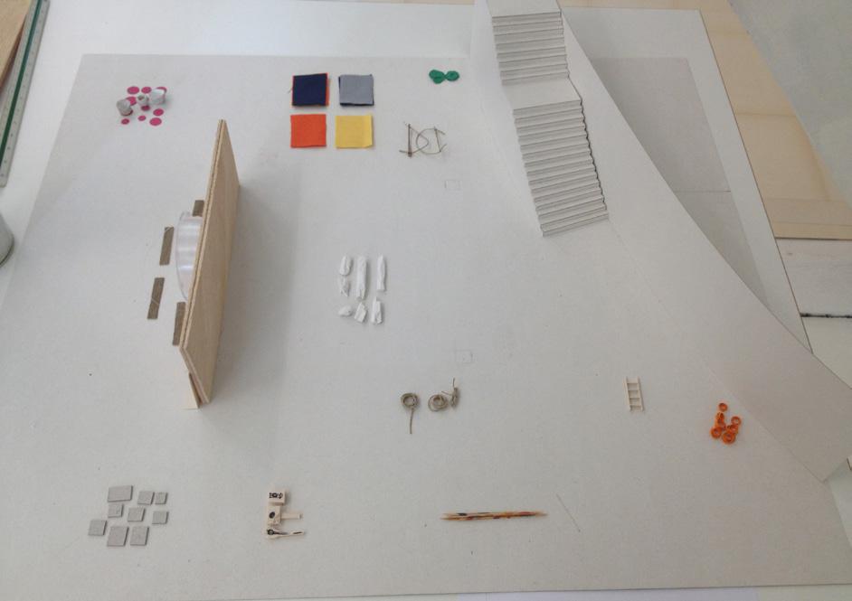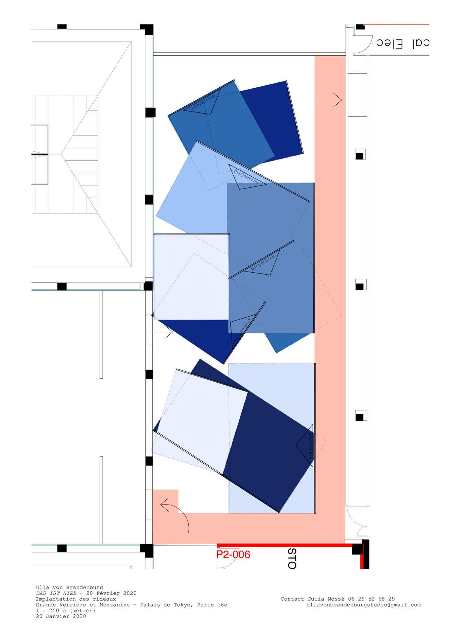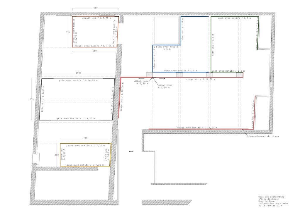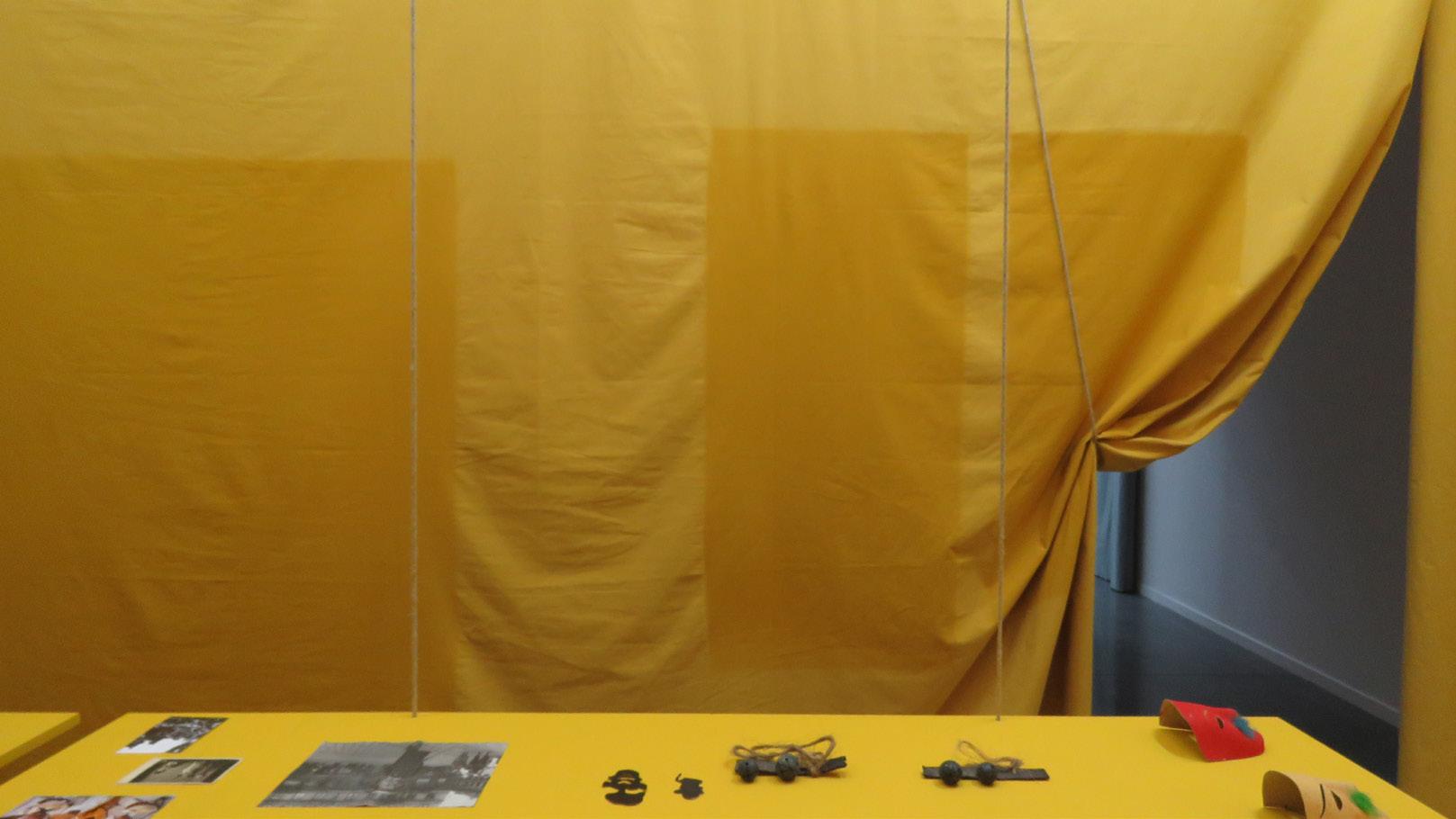 Suivi technique des aménagements scénographiques de l’exposition, dessins dwg d’implantation des installations, recherche et dessin de perspective centrale pour l’oeuvre Das Ist Was, teinture de tissu pour la confection de 7 poupées - marionnettes, montage de l’exposition