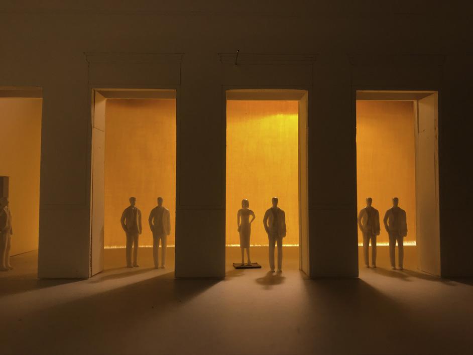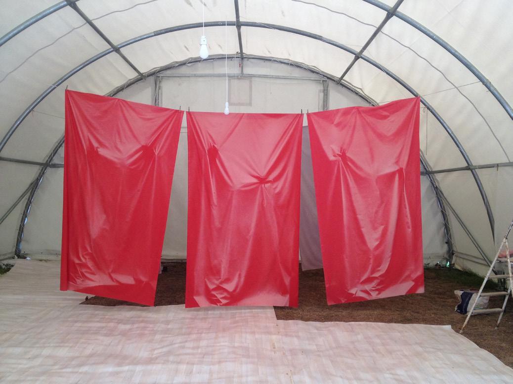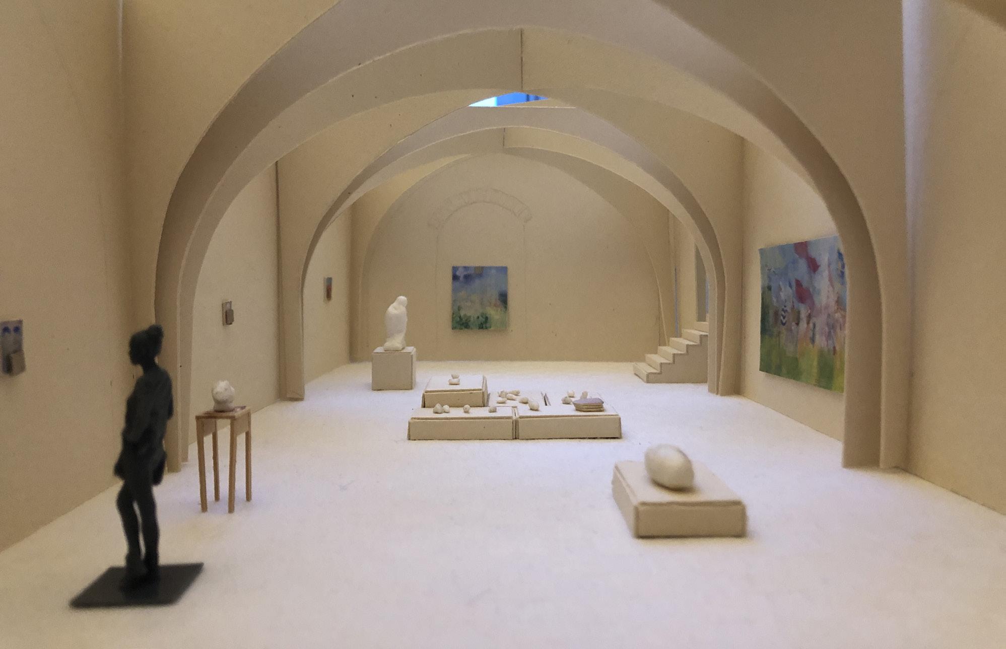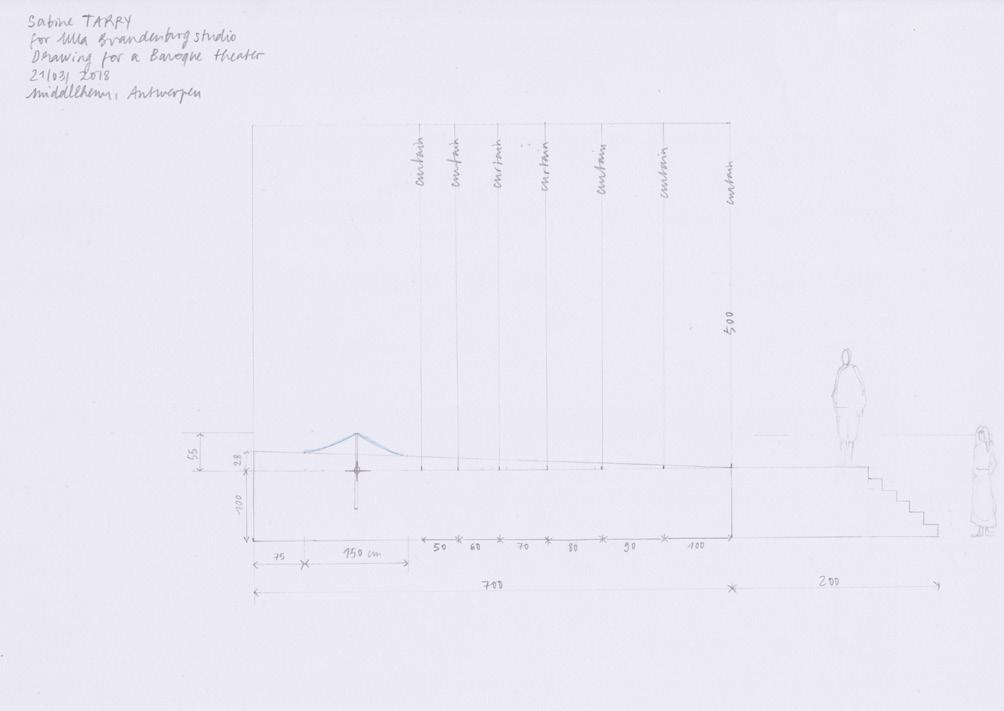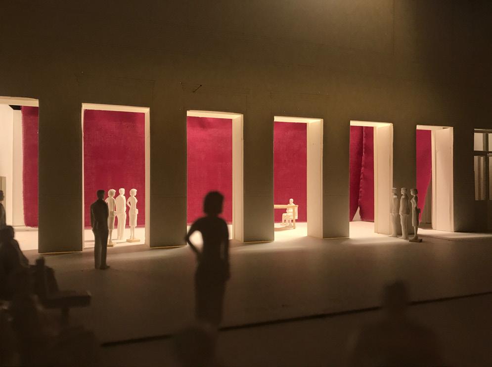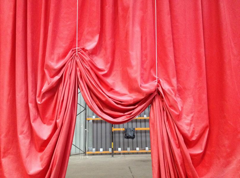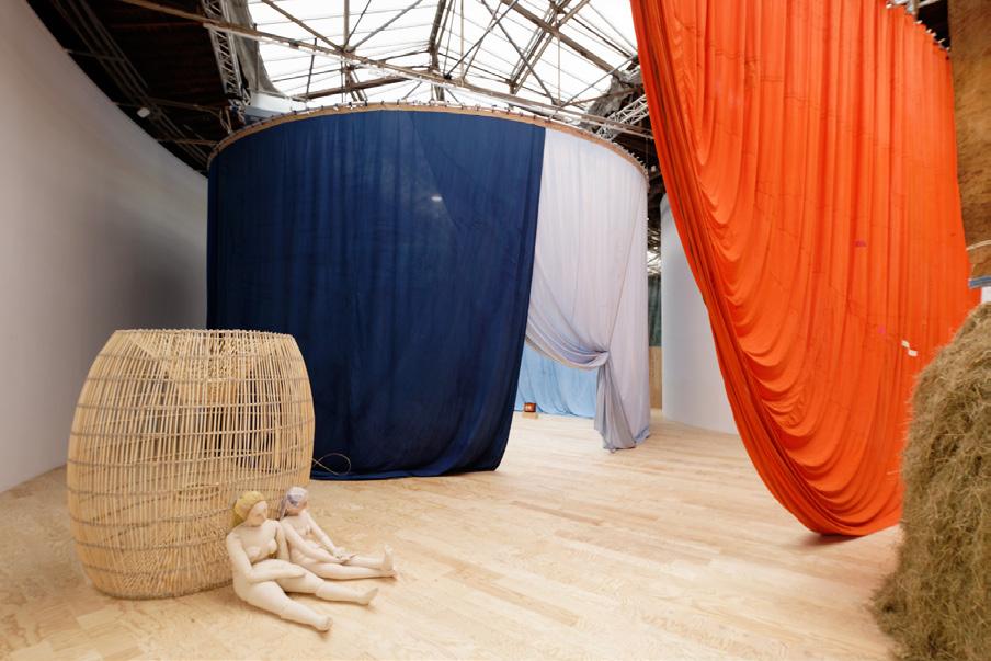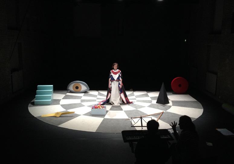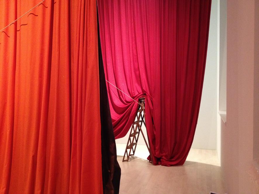 Suivi technique des aménagements scénographiques de l’exposition, dessins dwg d’implantation des installations, recherche et dessin de perspective centrale pour l’oeuvre Das Ist Was, teinture de tissu pour la confection de 7 poupées - marionnettes, montage de l’exposition