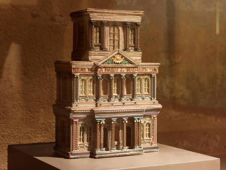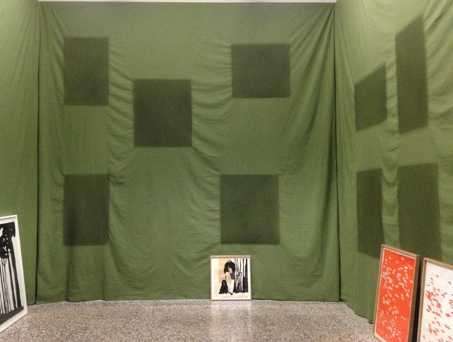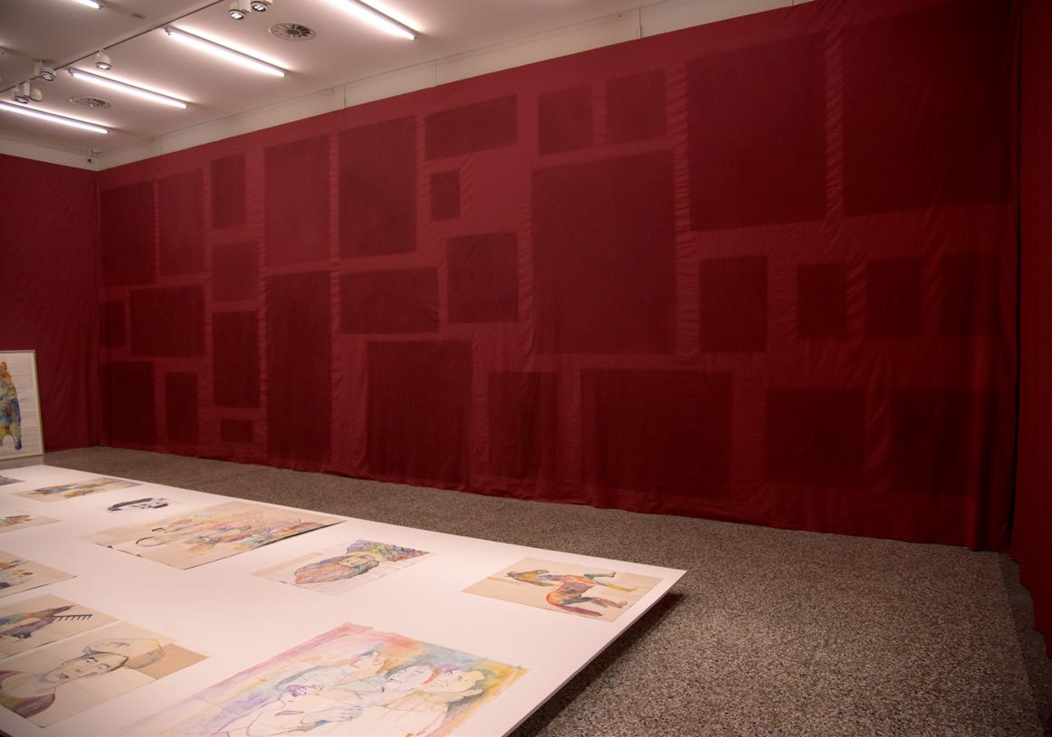 Conception, réalisation et adaptation d’une scénographie couvrant les murs du musée 28 tissus teintés et motifs peints en atelier, plateaux pour recevoir des dessins et collections d’objets, montage de dessins sur bois