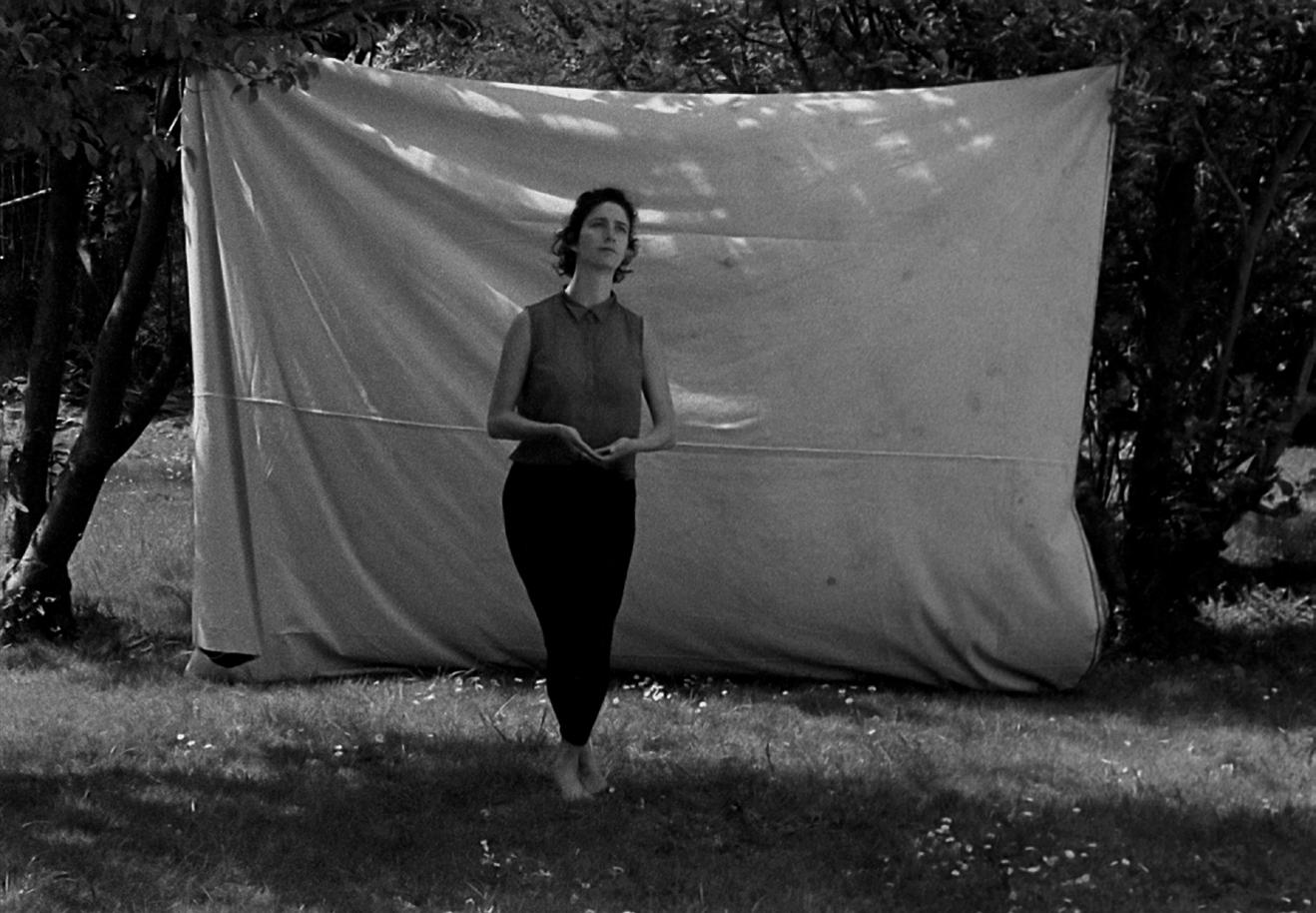 Production du film 16 mm Lebende Bilder, tourné dans un jardin : une danseuse incarne tour à tour les figures allégoriques de l’installation.
