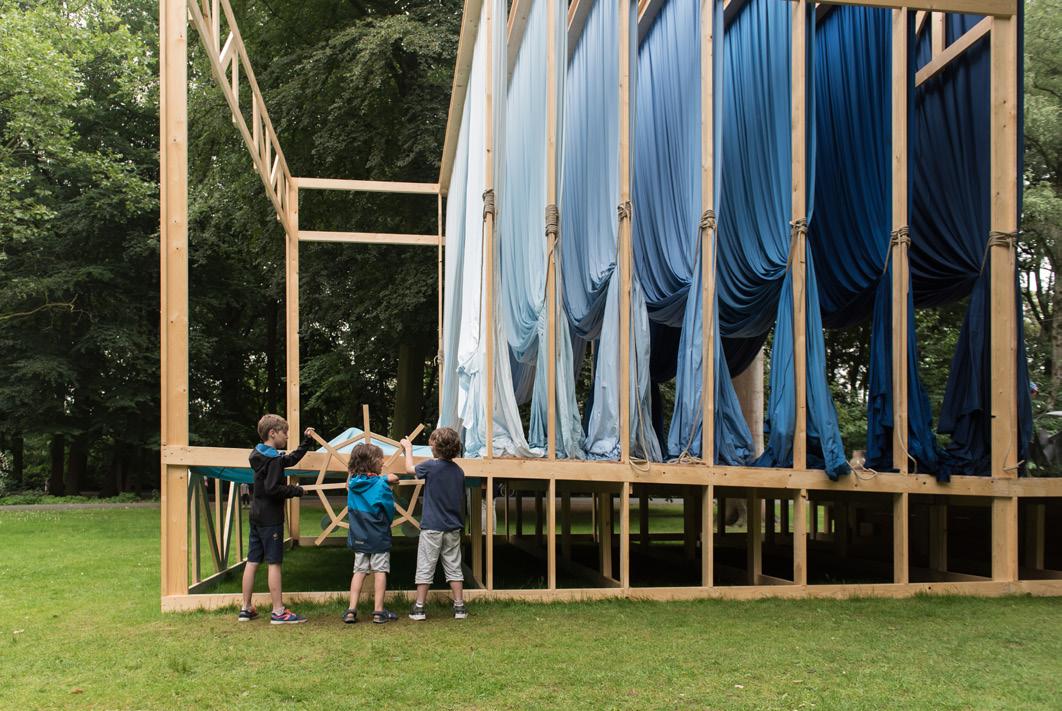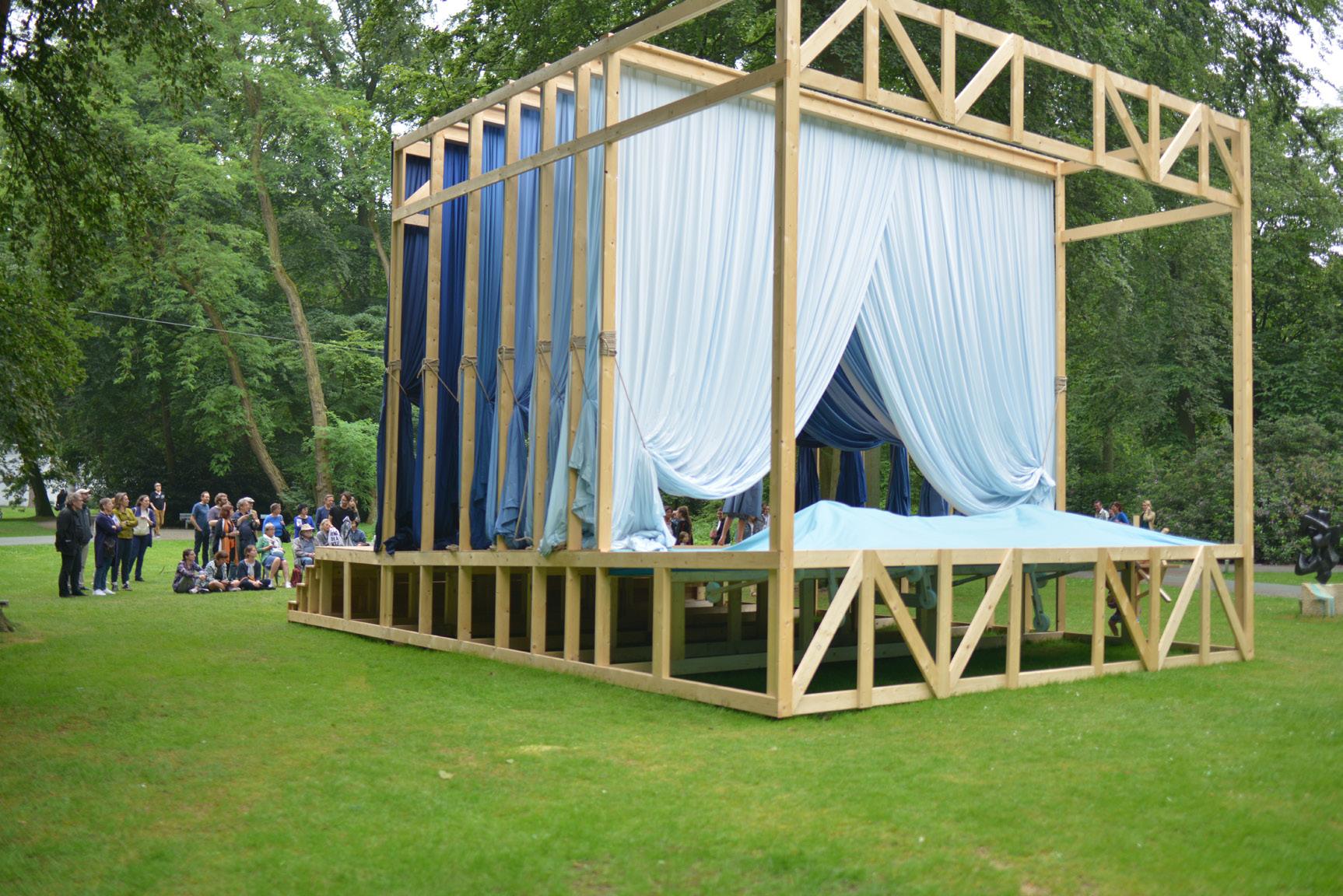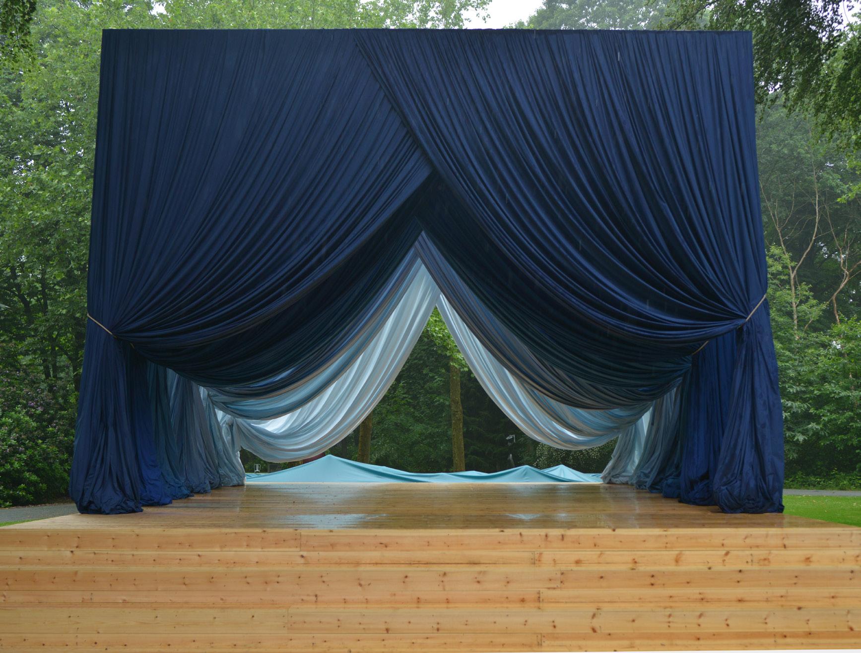 Conception et réalisation d’un petit théâtre baroque de plein air, avec un plancher montant, quatorze rideaux et une mer mécanique (7 x 7 x 6 m)