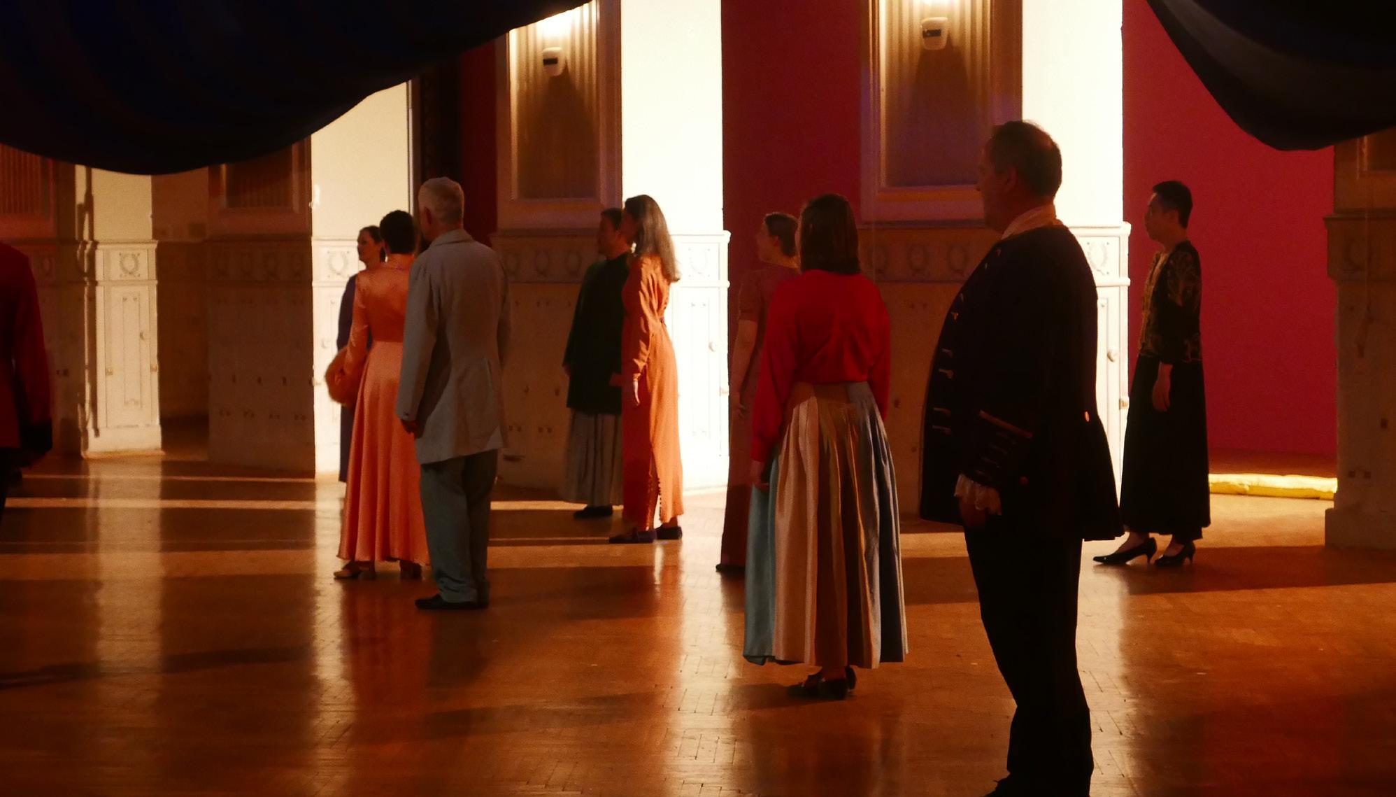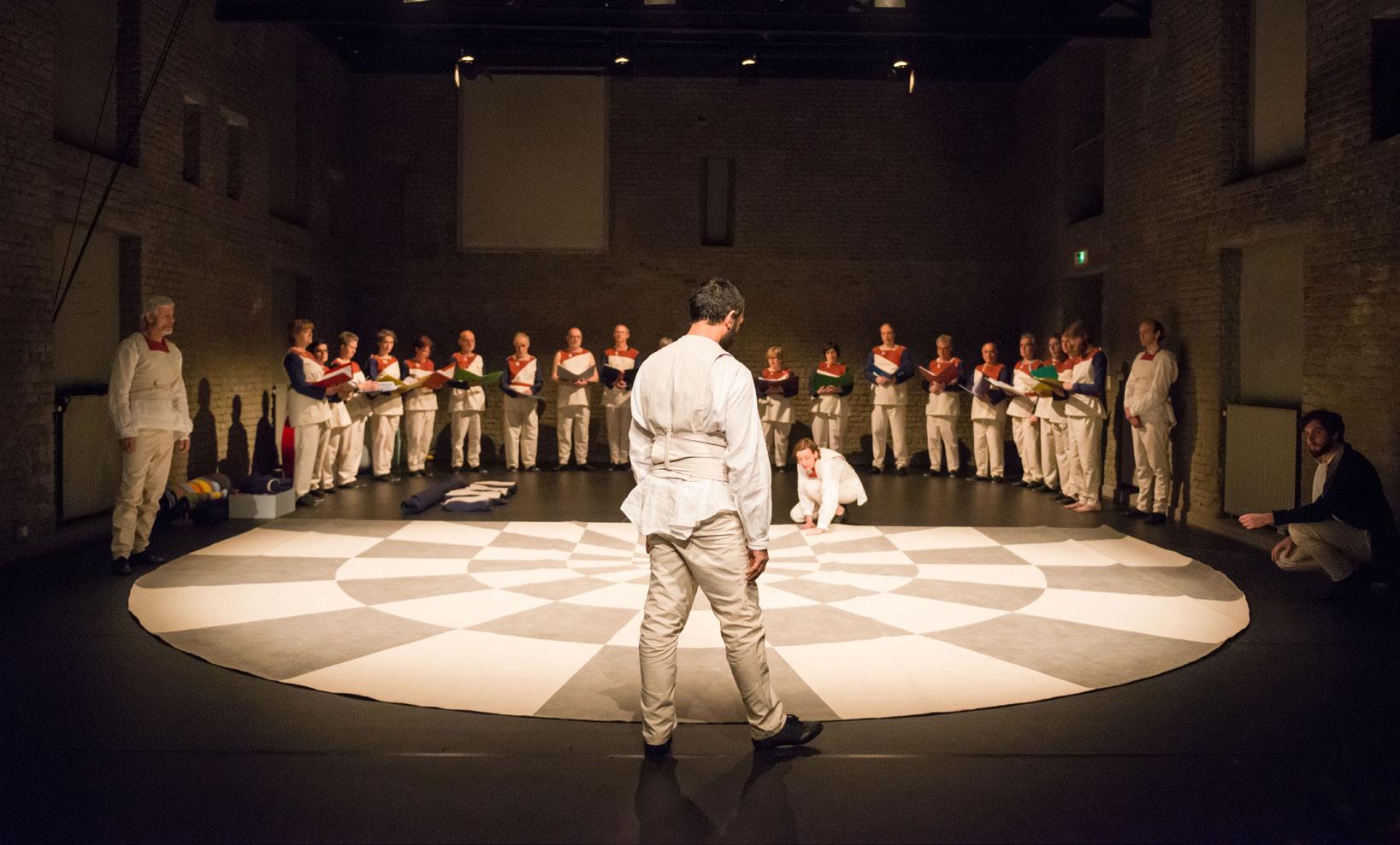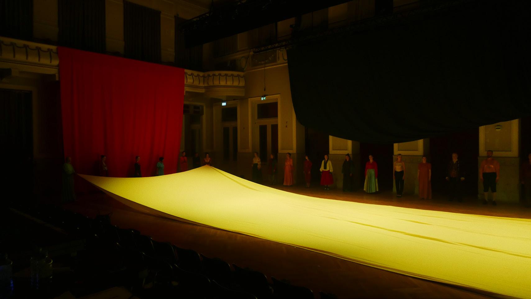 Performance déambulatoire pour cinq acteurs et un choeur, inspirée des célébrations de la communauté saint-simonienne de Ménilmontant : rituels chorégraphiés d’habillage, textes chantés, objets manipulés, et réalisation d’un film 16 mm tourné au Jaunais Rīgas Teātris (New Riga Theatre)