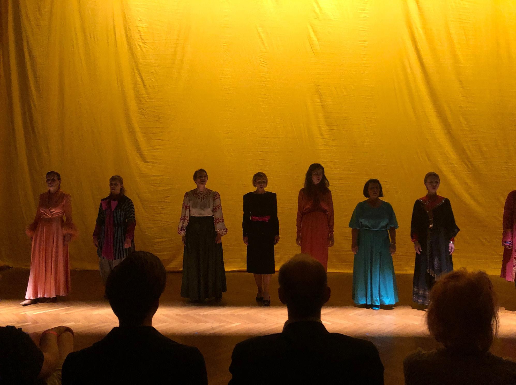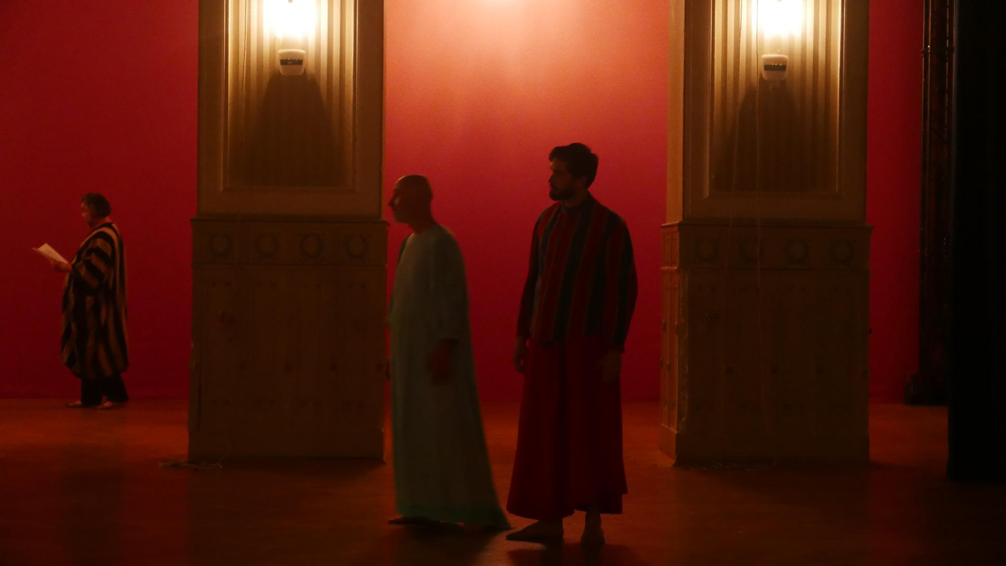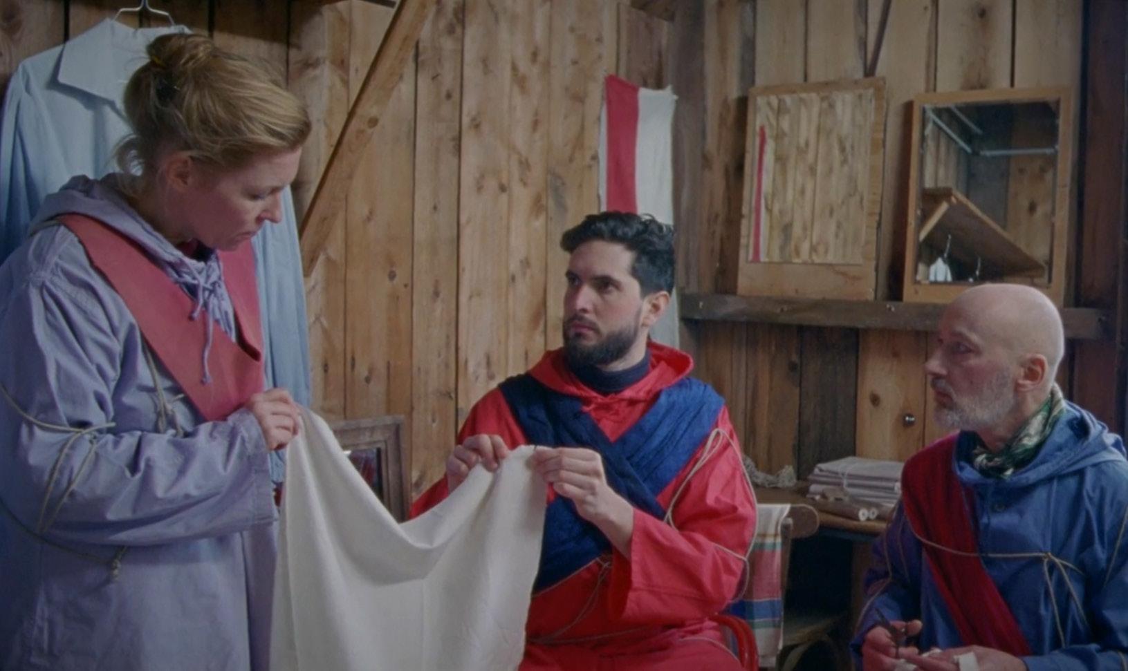 Performance déambulatoire pour cinq acteurs et un choeur, inspirée des célébrations de la communauté saint-simonienne de Ménilmontant : rituels chorégraphiés d’habillage, textes chantés, objets manipulés, et réalisation d’un film 16 mm tourné au Jaunais Rīgas Teātris (New Riga Theatre)