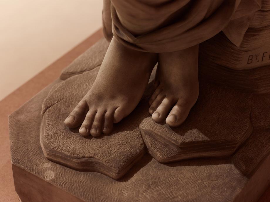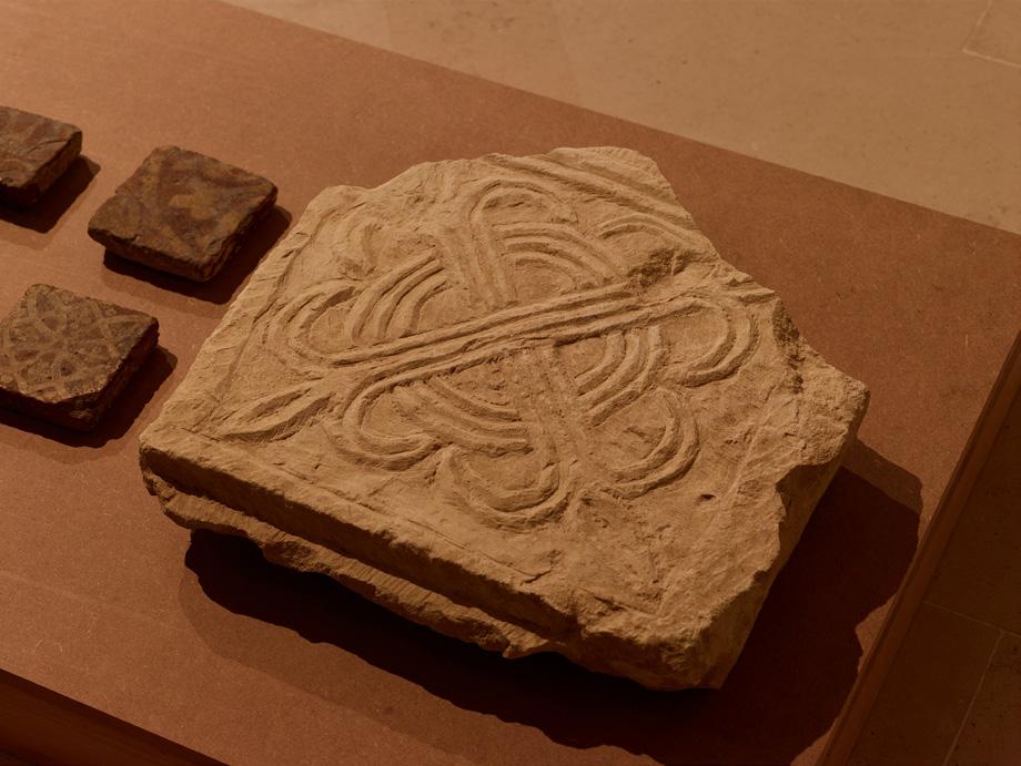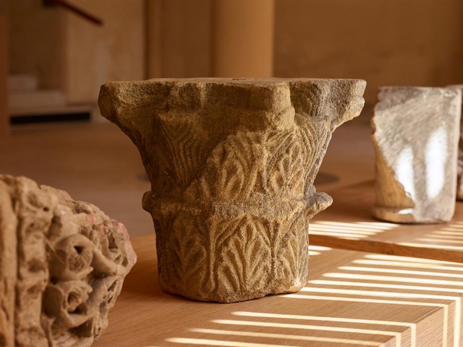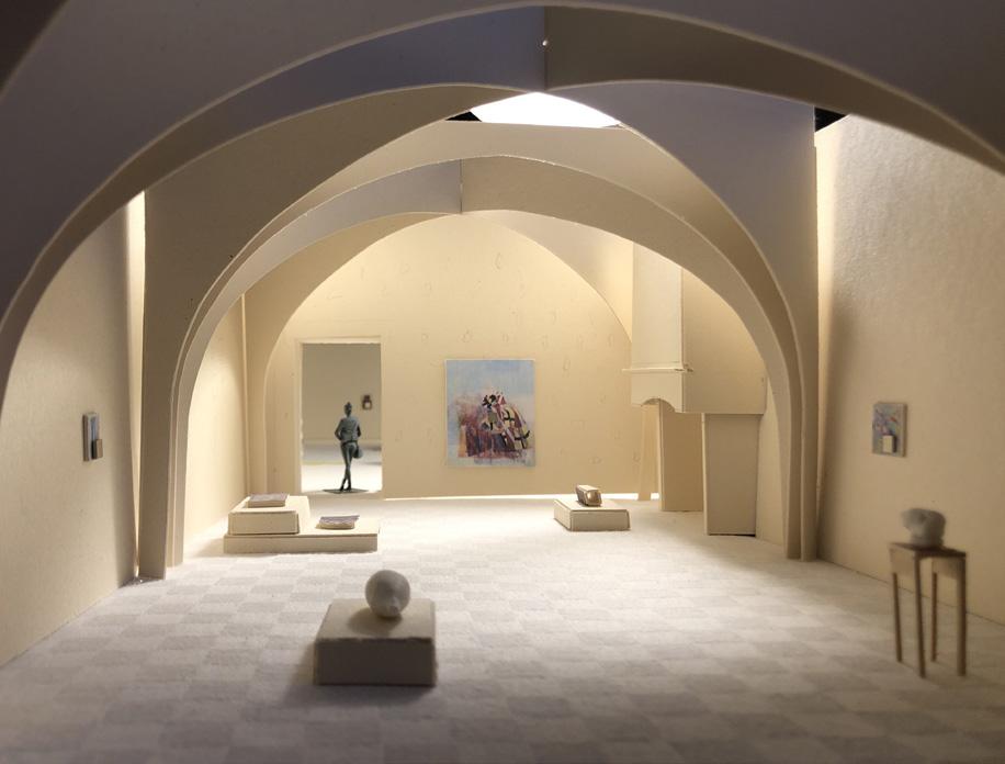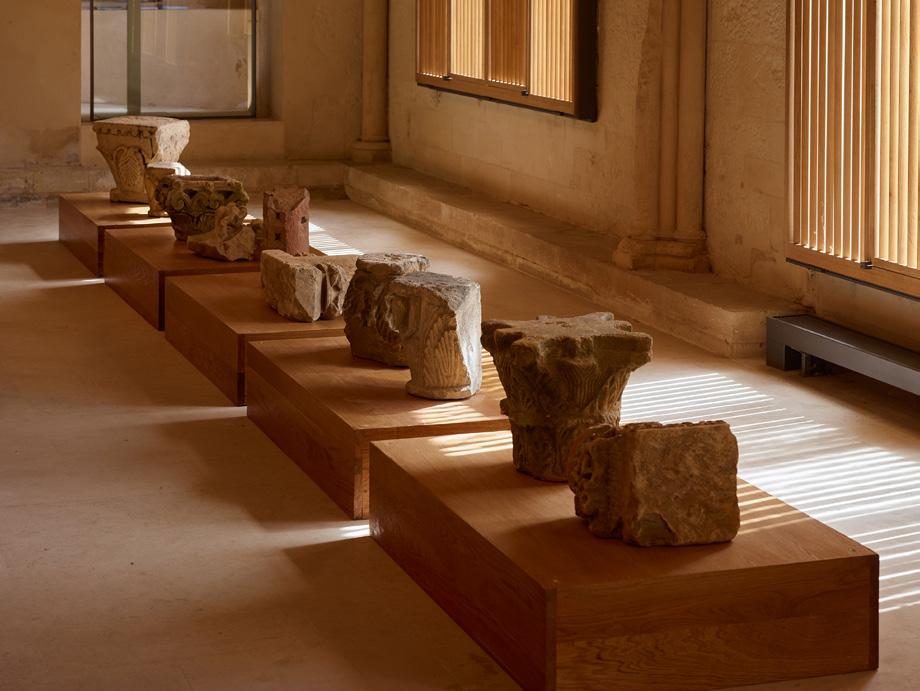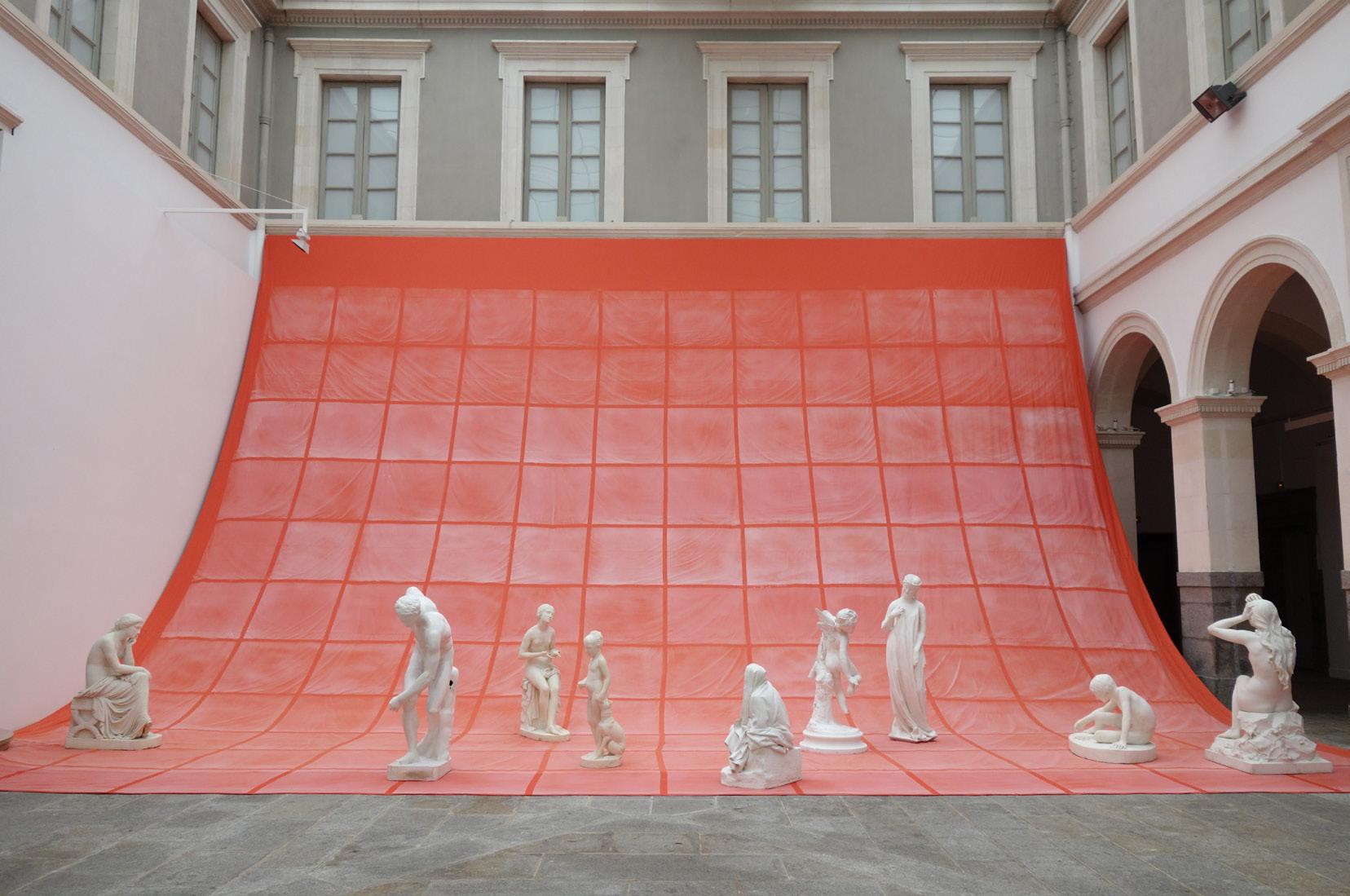 Installation d’un tissu décoloré et composition d’un tableau avec une sélection de sculptures en marbre et plâtre du musée (tissu 14 x 14 m)
