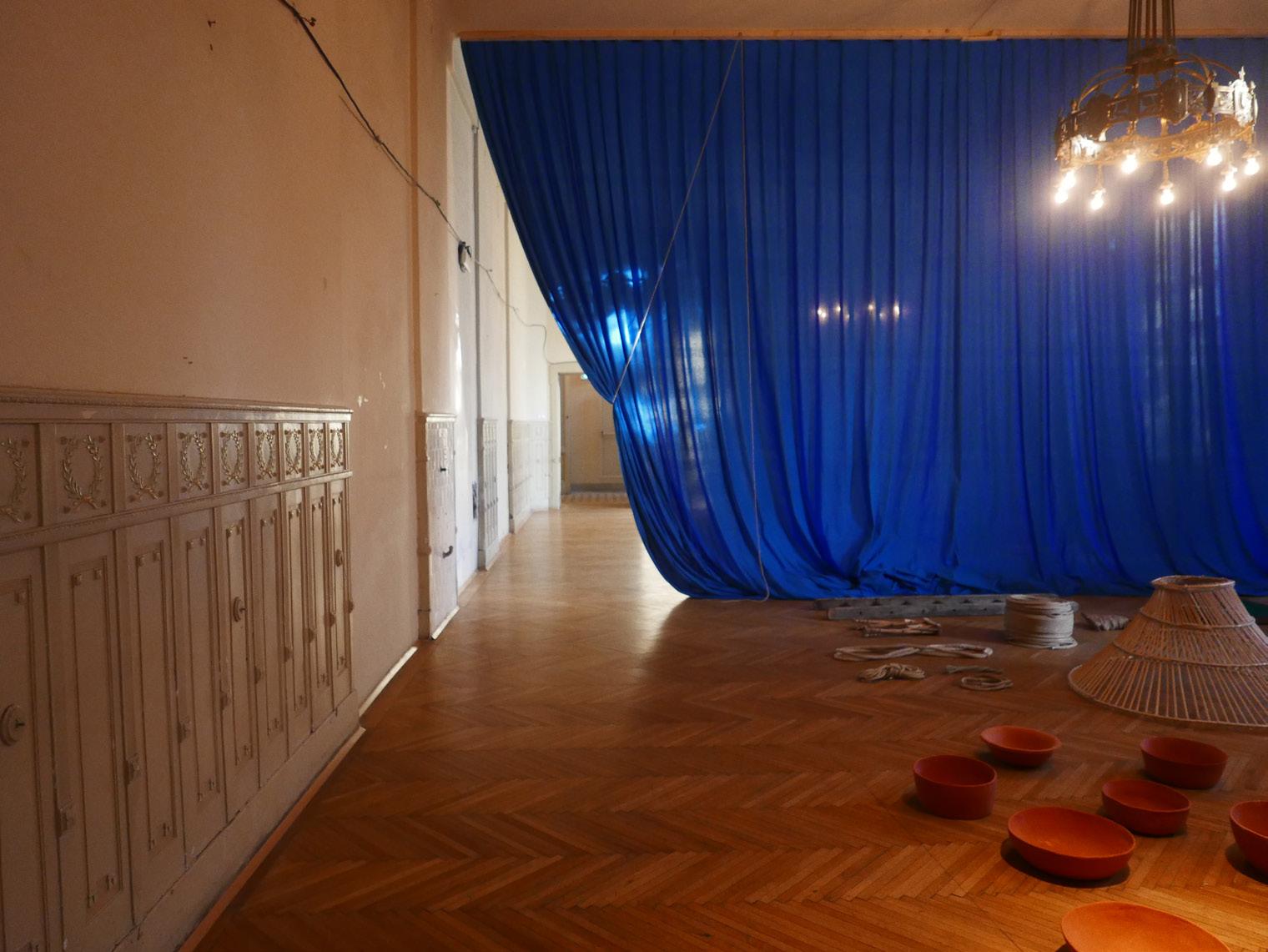 Conception et réalisation d’une scénographie pour une performance et une exposition sur le don et les rituels d’échange : fabrication d’un ensemble d’objets en bois, céramiques, instruments de musique, rubans teintés et cannes en bambou peintes