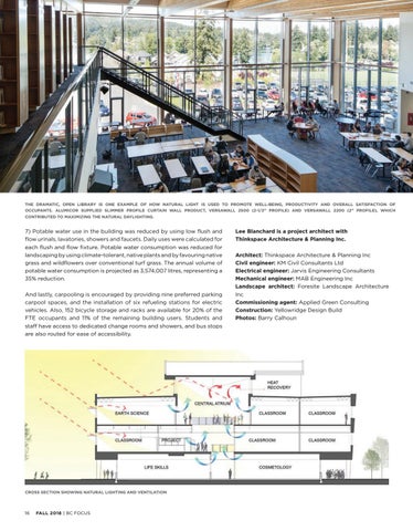7) Potable water use in the building was reduced by using low flush and flow urinals, lavatories, showers and faucets. Daily uses were calculated for each flush and flow fixture. Potable water consumption was reduced for landscaping by using climate-tolerant, native plants and by favouring native grass and wildflowers over conventional turf grass. The annual volume of potable water consumption is projected as 3,574,007 litres, representing a 35% reduction. And lastly, carpooling is encouraged by providing nine preferred parking carpool spaces, and the installation of six refueling stations for electric vehicles. Also, 152 bicycle storage and racks are available for 20% of the FTE occupants and 11% of the remaining building users. Students and staff have access to dedicated change rooms and showers, and bus stops are also routed for ease of accessibility.