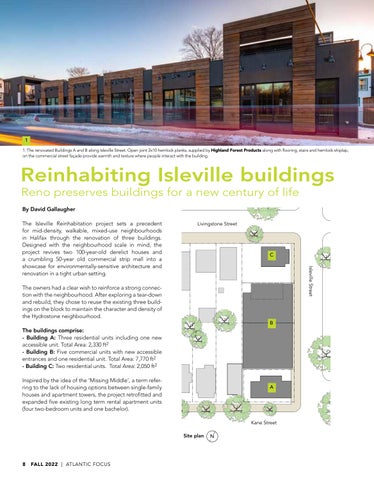 Reinhabiting Isleville buildings Reno preserves buildings for a new century of life By David Gallaugher The Isleville Reinhabitation project sets a precedent for mid-density, walkable, mixed-use neighbourhoods in Halifax through the renovation of three buildings. Designed with the neighbourhood scale in mind, the project revives two 100-year-old derelict houses and a crumbling 50-year old commercial strip mall into a showcase for environmentally-sensitive architecture and renovation in a tight urban setting.