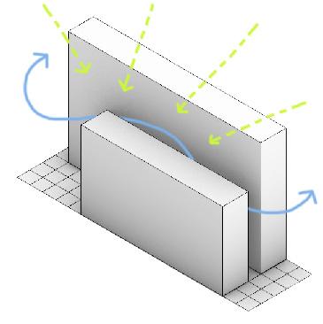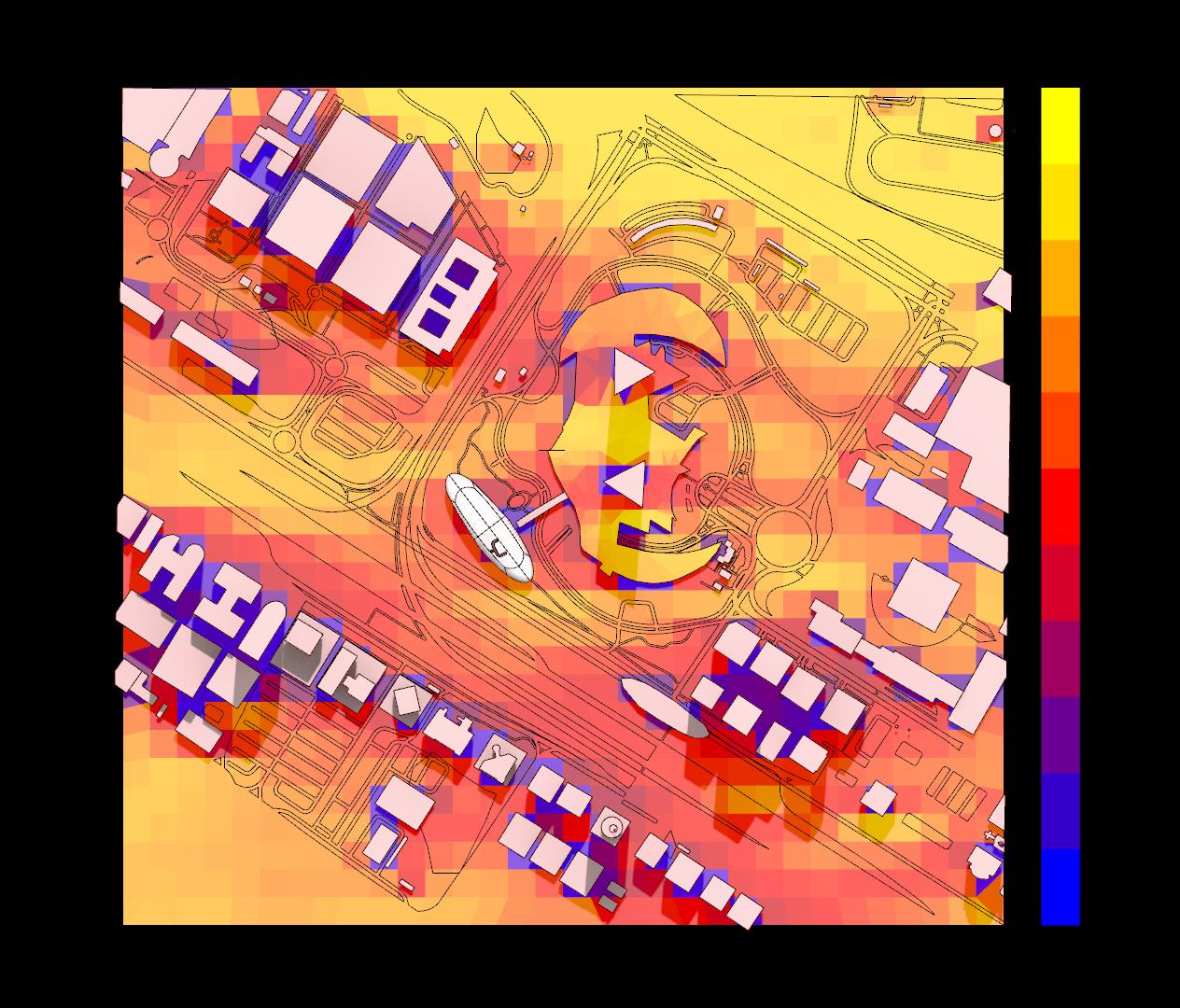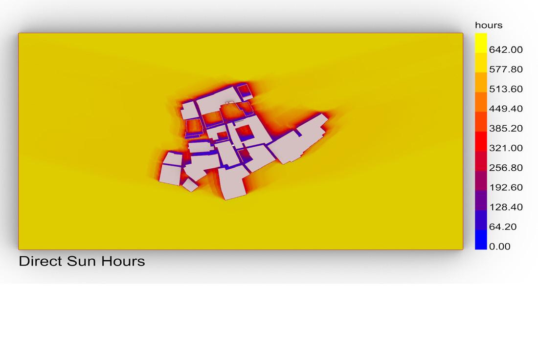 GrassHopper and LadyBug plugins were used to create a study of the total hours of direct sunlight that the site was exposed to. Due to the high total hours of direct sunlight, certain design solutions such as; Roof overhangs, Slanted roofs, Sikkas and tesselated walls were used as a design solution to limit sun exposure.