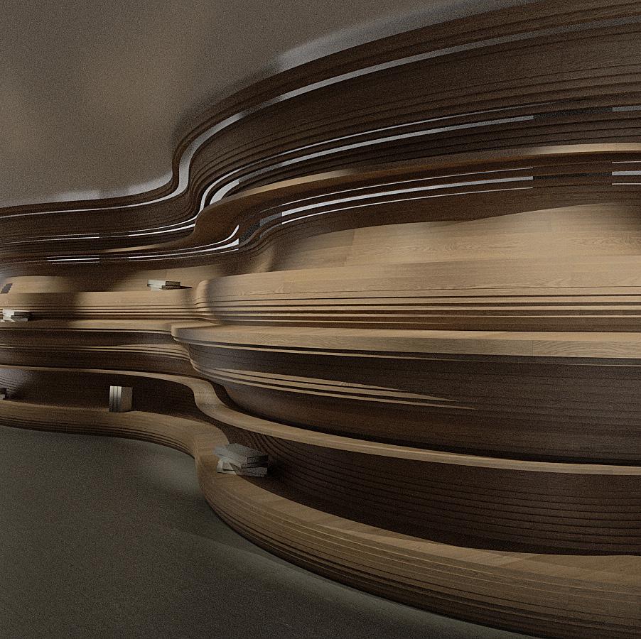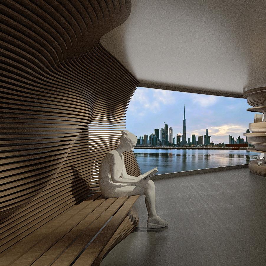 The waves of the Dubai creek were studied through the website 'Ventusky'. The wave patterns were then used to design furnitures for the gallery space of the library.