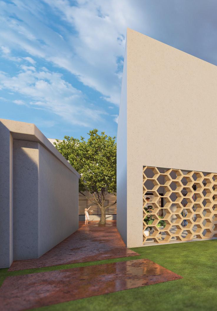 A community center that serves local families and the labor workers of the historical site of Sharjah. The proposal tackles design problems such as excessive amount of direct sunlight by incorperating slanted roofs, overhangs and tesselated walls to filter natural sunlight through spaces, creating a sensual atmosphere. This project is a courtyard based typology that follows a radial organization.