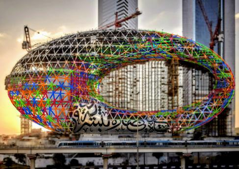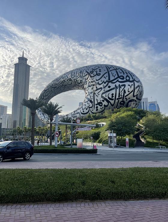 The Museum of the Future showcases a striking and unique facade made of stainless steel and illuminated by thousands of LED lights, creating a dynamic and futuristic appearance. The structure itself is composed of intricate geometric shapes and curves, featuring advanced engineering and cutting-edge technology. Inside, the museum showcases interactive exhibits and immersive experiences that explore the possibilities of emerging technologies and their potential impact on society.