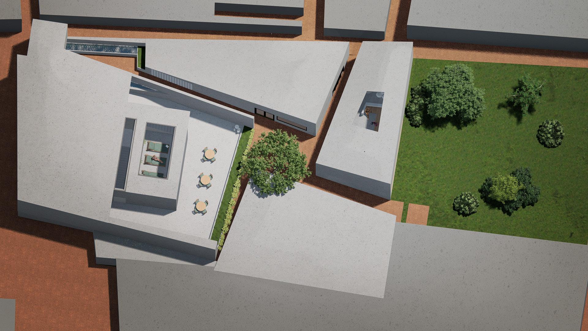 A free form courtyard typology derived by using a radial orginization. The radial organization terminates at the most important aspects of the design such as: The entrance, the two waterfalls and the existing garden. The node of the central organization marks the courtyard.