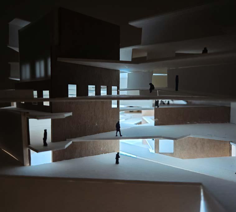 New floors are added to the existing floors with a half-floor height difference. This not only accommodates the shallow ramps but also blurs the vertical separation usually caused by stacking. It also builds in the opportunity for the walkways to alternately express public use in addition to access. The misuse creates a unique proximity between different spaces, including the ramps, by purposefully making inefficient stacking.