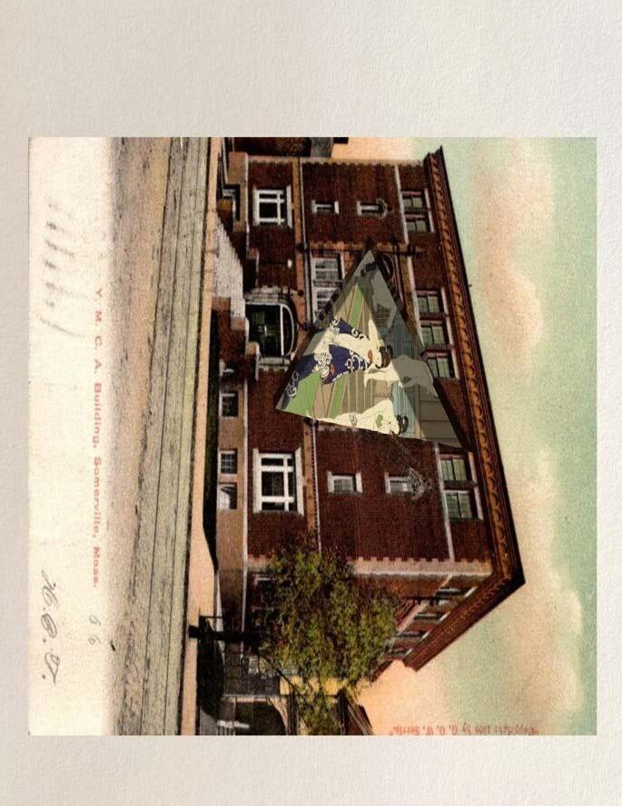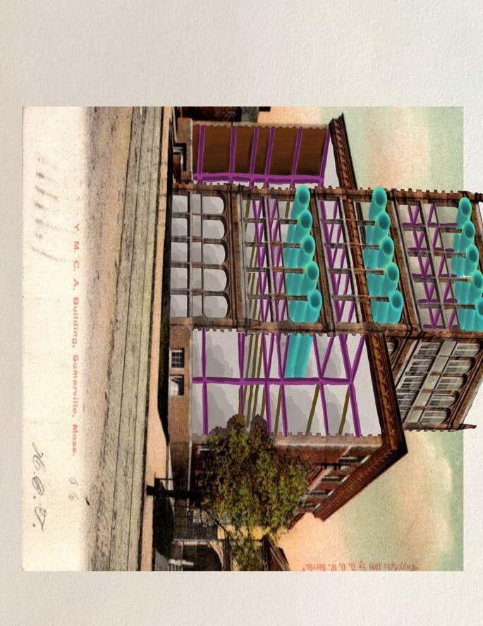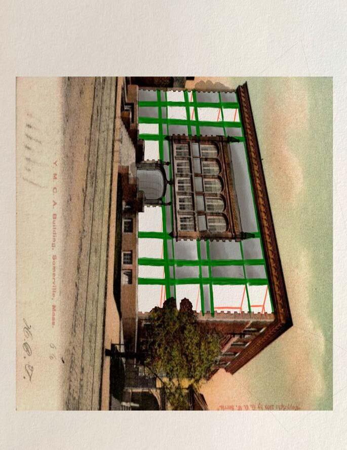 Series of collages using the historical postacard of Somerville YMCA for massing study. サマーヴィルYMCA歴史的なポストカードを使ったボリュームスタディ用のコラージュ一覧。