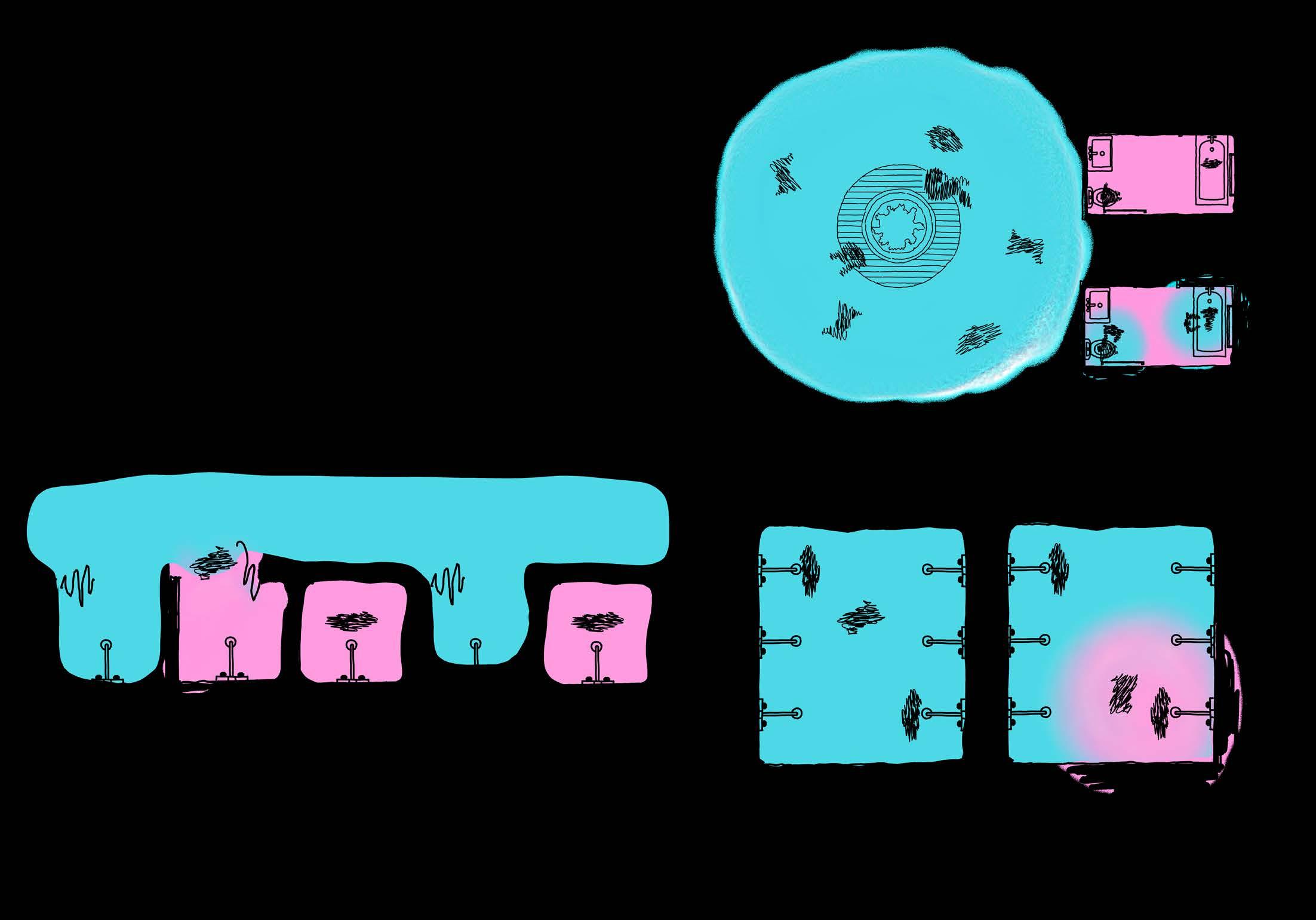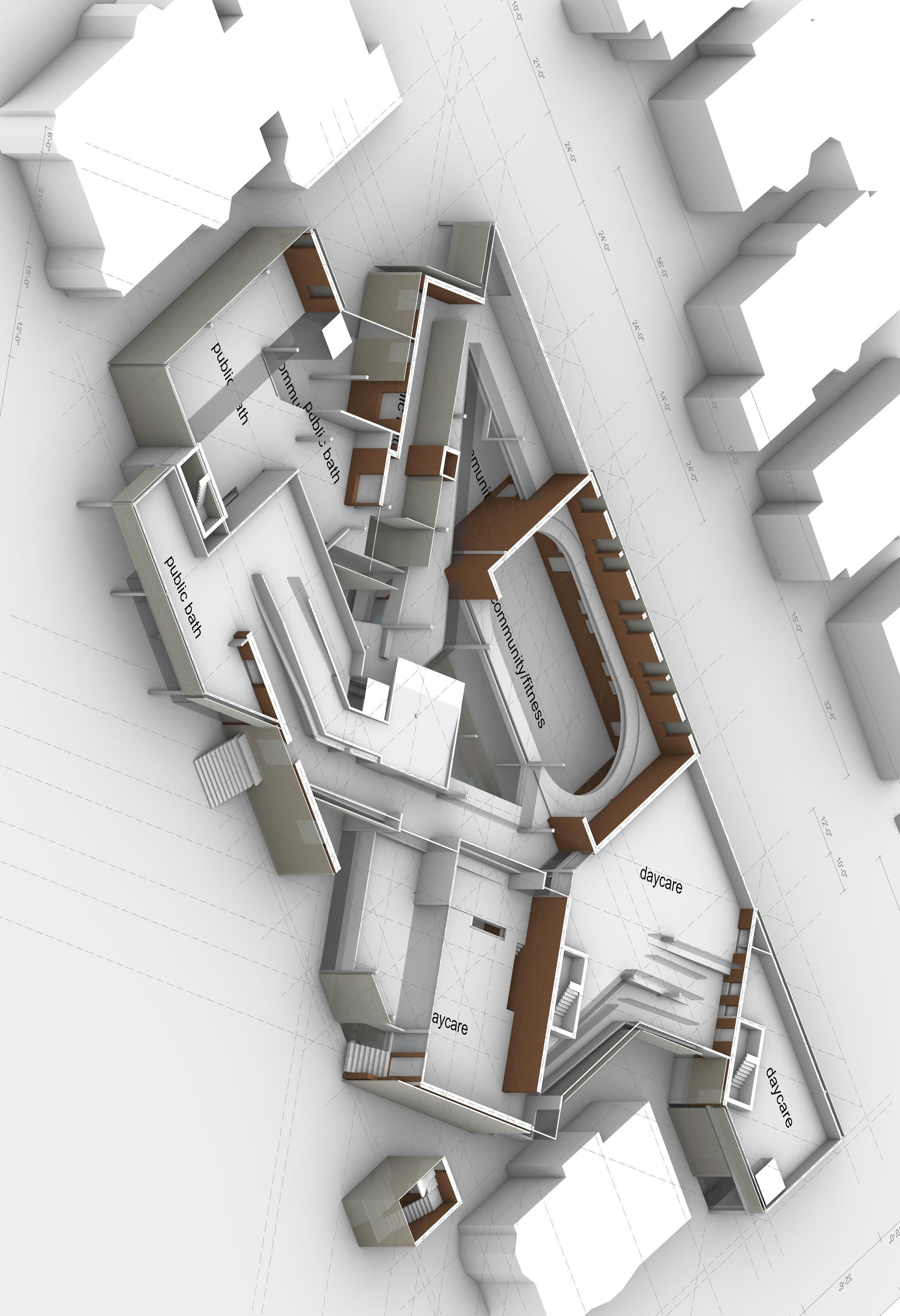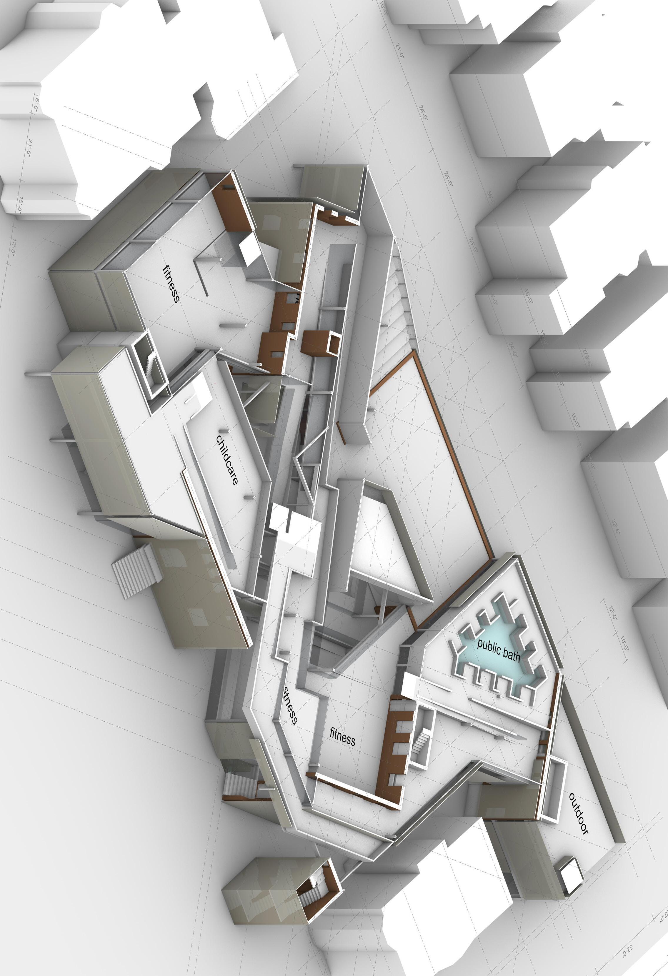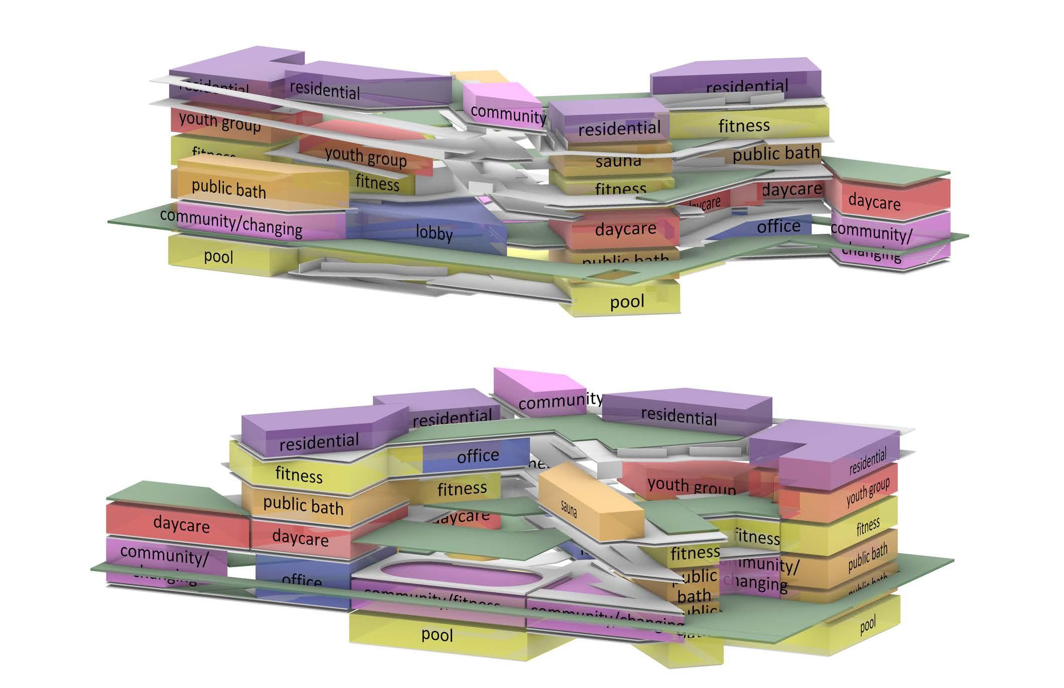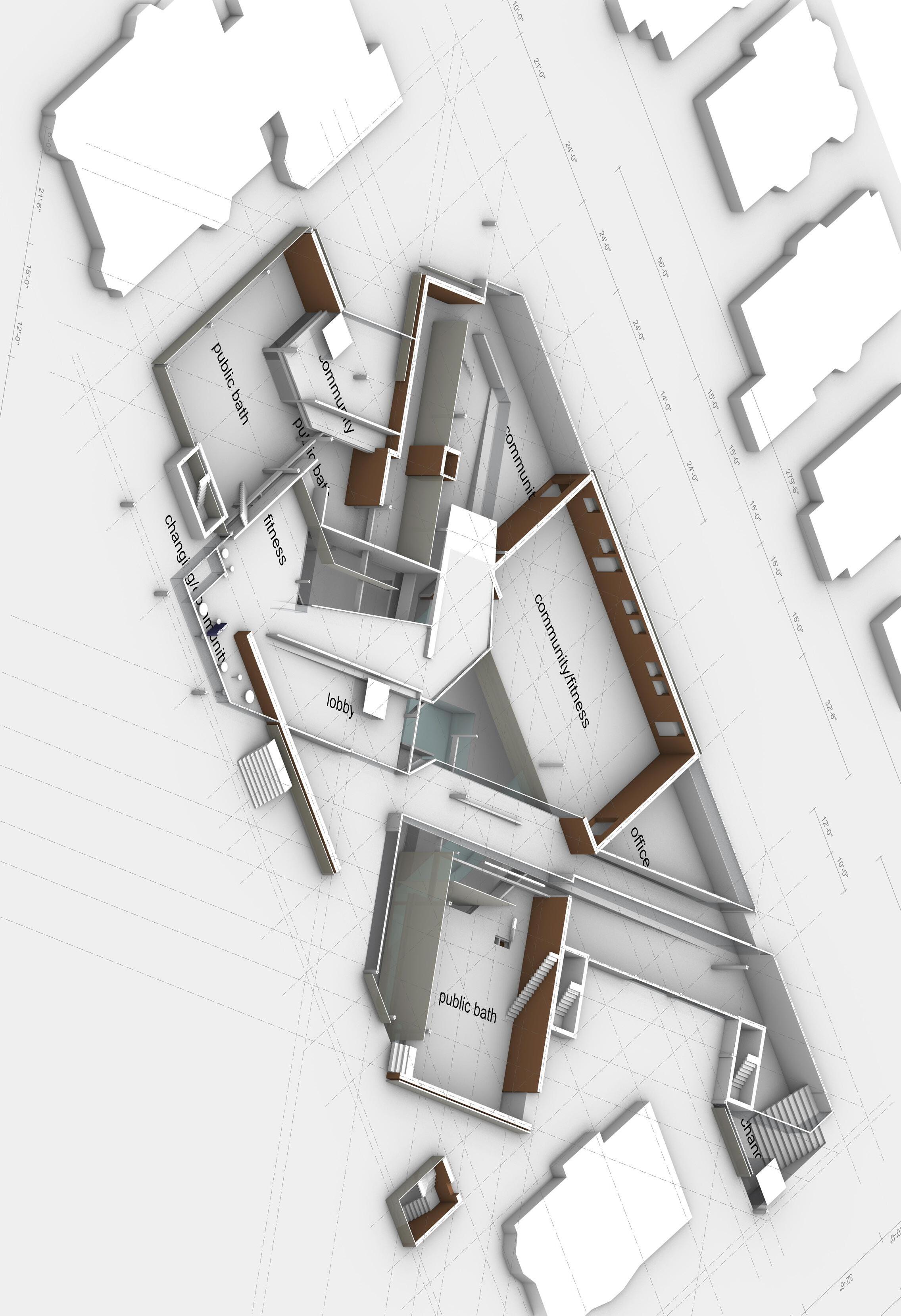 Here, the program diagram is laid out in the building. Some programs, such as public baths, community spaces/changing rooms, and saunas, repeat themselves in multiple locations and sizes. The difference in room size accommodates various types of gatherings, further expanding the number of options available to users in each variation.