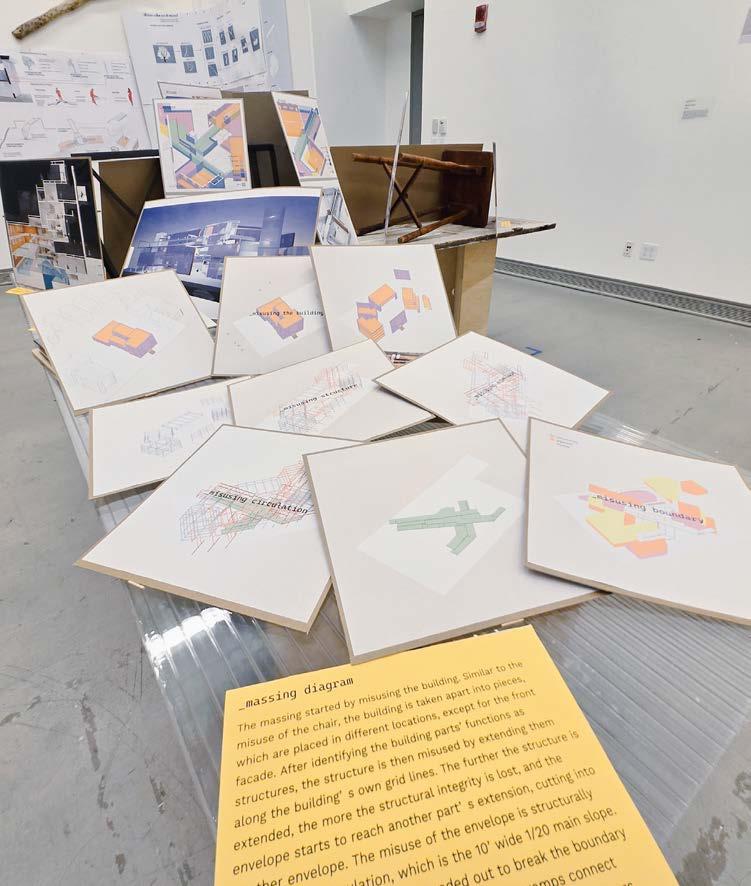 The massing was developed using the preservation of misuse as a design principle. Similar to the misuse of the chair, the building is pulled apart, and the pieces are redistributed to multiple locations. The front facade alone remains in its existing location.