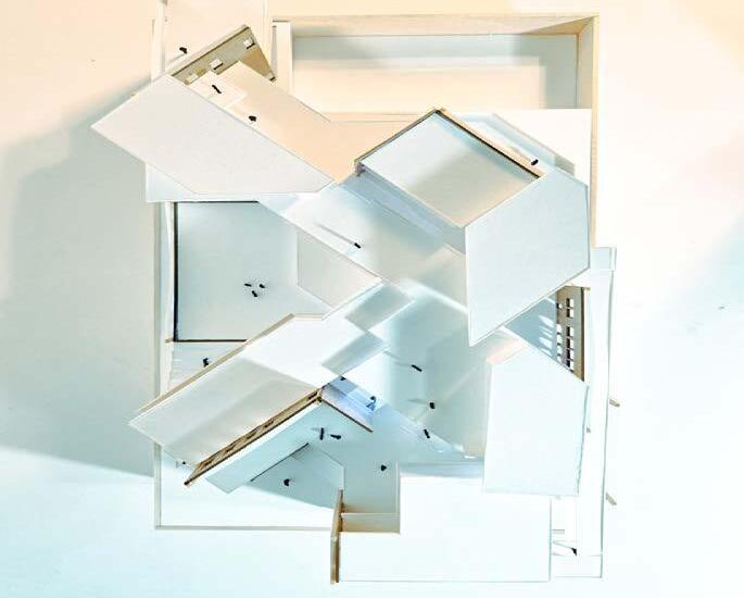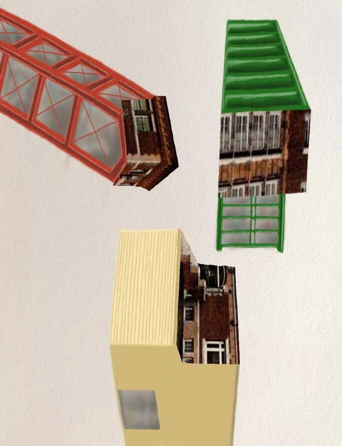After identifying the building parts’ functions as structures, the structure is then misused by extending beams, columns, and frameworks along the building’s own grid lines. The further the structure is extended, the more structural integrity is lost, and the elements of the envelope start to overlap on another part’s extension, cutting into another envelope. These shifted elements overlap and split the facade, transforming into a new combined form. The building opens up new ways of seeing in, new means of access, and develops new boundaries between inside and outside.