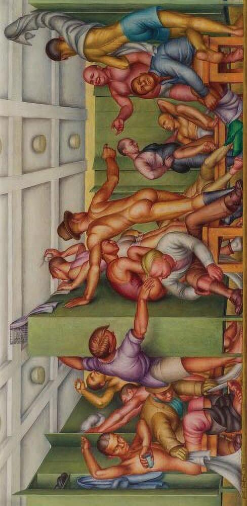 The painting depicts a bustling locker room scene at the YMCA, where a group of men are in various stages of undressing and dressing. Cadmus intentionally represents cruising amid the crowd, capturing the tension and proximity between the homosocial and homoerotic interactions.