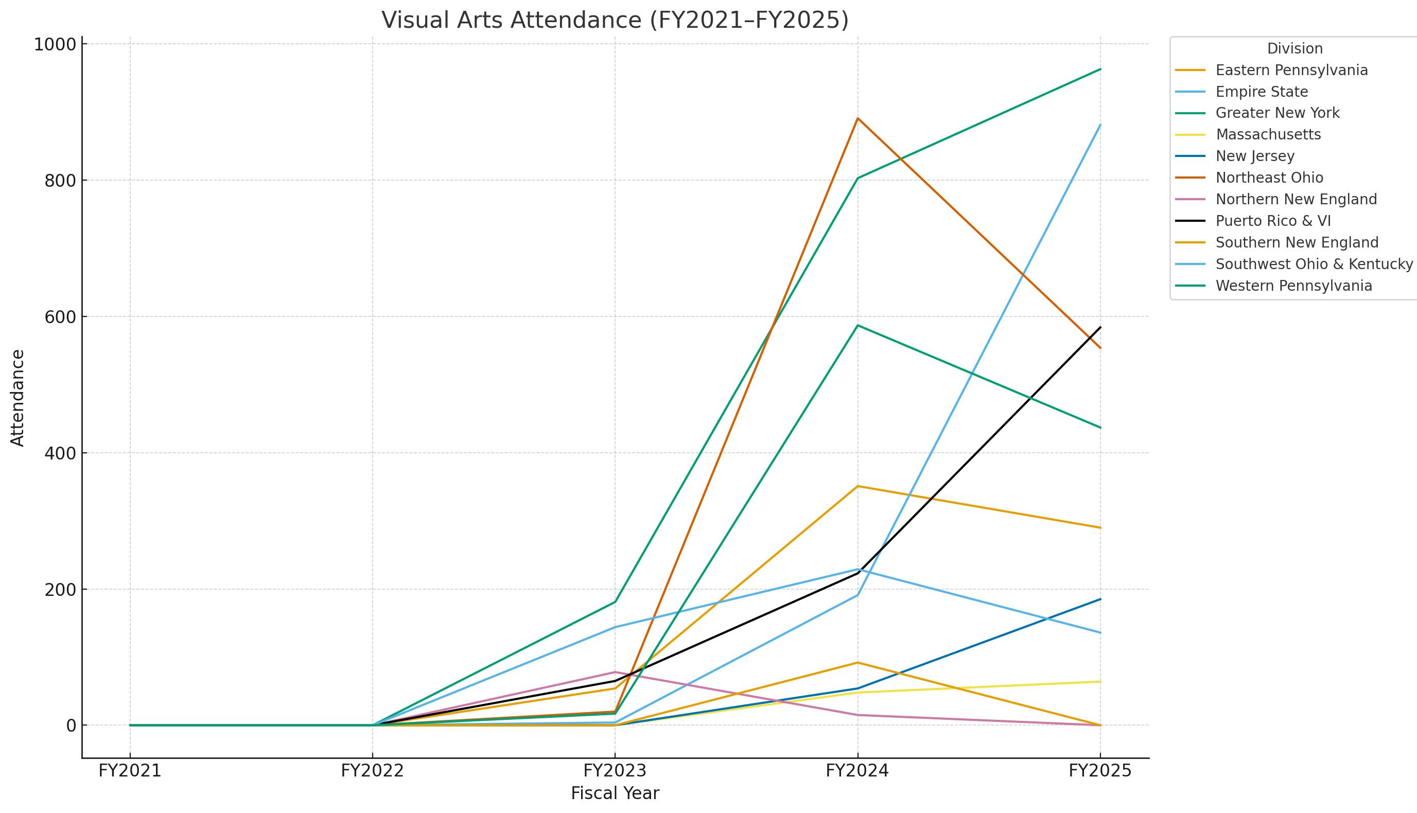 During the 2024-2025 program year, the Greater New York division had the highest visual arts attendance in the Eastern territory with 963 participants. They also experienced the second highest in theatre attendance in the territory with 3,173 participants, and second highest in dance attendance with 5,734 participants.