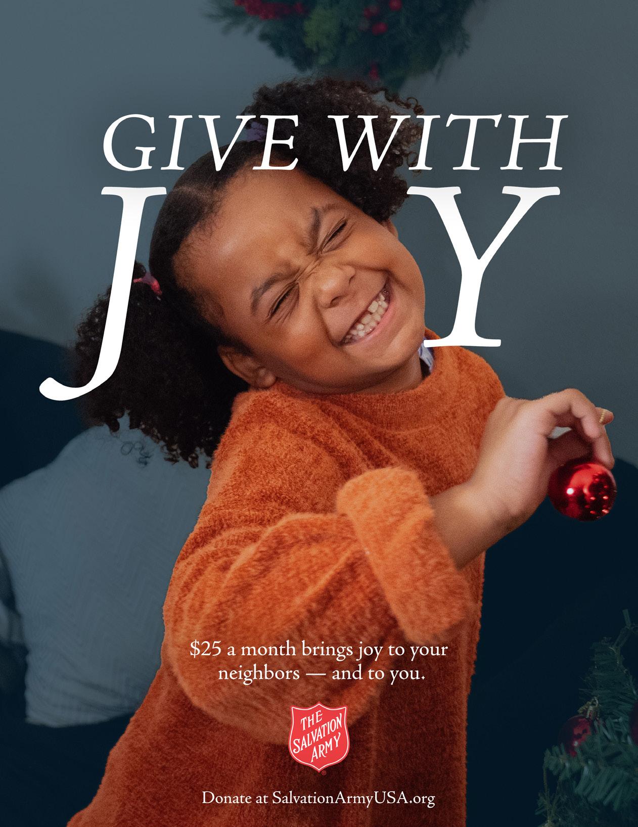 GivingTuesday (#GivingTuesday) is the Tuesday after Thanksgiving in the United States and falls on December 2 this year— right in the heart of the holiday season. Created in 2012, it is touted as a “global generosity movement unleashing the power of people and organizations to transform their communities and the world.” You can give to The Salvation Army on GivingTuesday and year-round at www.salvationarmyusa. org or call 1-800-SAL-ARMY.
