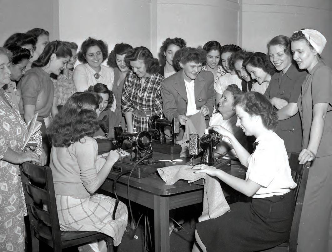 Seated at sewing machines, left to right: Lois Hepworth, Ethel Frey, Margaret Moore and Sally Martin