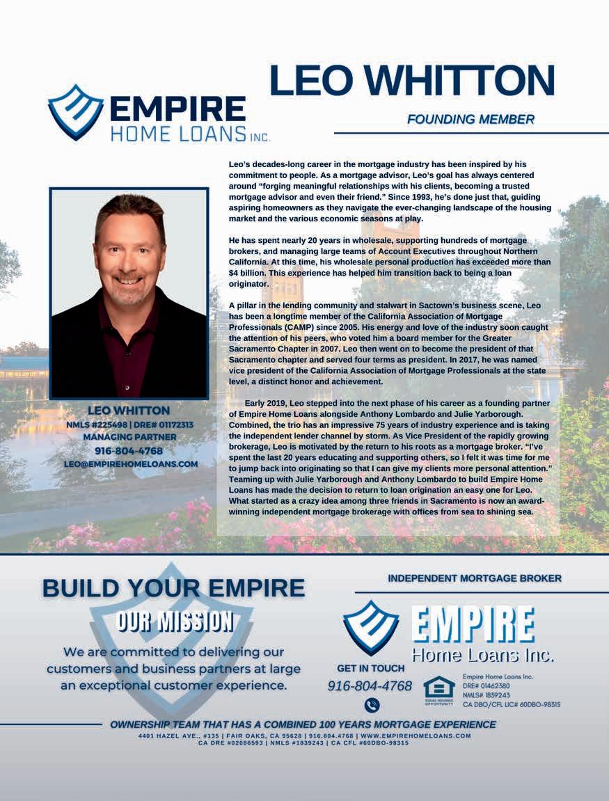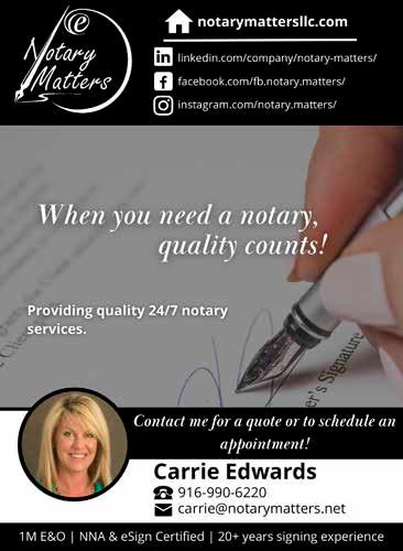 62 • October 2023 @realproducers realproducersmag.com Investing: Self-service is no service Linda Sobon Financial Advisor (916) 673-6549 linda.sobon@edwardjones.com 2360 E Bidwell Ste, Suite 102 Folsom, CA 95630 Member SIPC I work with Matthew and his team regularly, multiple times a month and couldn't be happier with the services he provides. He is always very professional, punctual, and responsive. Working with him has been smooth and easy every step of the way! His work is professional quality and always consistent. would definitely recommend Dynamic Cinema Productions to anyone looking for professional photography and/or video production. Sabrina Khal - Project Manager SERVICES: 530-417-6170 DynamicCinemaProductions.com/real-estate HIGH QUALITY STORY TELLING PHOTOGRAPHY & AERIAL • VIDEO TOURS • 3D MATTERPORT AND 2D FLOOR PLANS BUSINESS COMMERCIALS • PORTRAITS • WEDDINGS & EVENTS • TOURISM AND MORE Founder / Creative Director Staging That Sells Beyond Expectations TheStagingConnection.com • 530-713-5384 Mention this ad for a $250 DISCOUNT in October! CHECK OUT OUR WORK! @TheStagingConnection Alicia Stearman Branch Manager NMLS #337154 10002 Foothills Blvd Suite 100 Roseville, CA 95747 O: 916-846-5241 C: 916-256-6486 Buying · Refinancing · Renovating Here to give your clients the outstanding home loan experience they deserve. aliciastearman.com AGENT REFERRAL FEE: $500.00