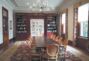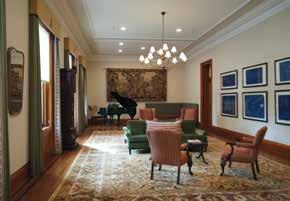 been repurposed for conference and meeting use, and matched with a generous donation of restored Michael Taylor chairs. The original pattern designs for the parlor’s iconic centerpiece quilt—hand-crafted for the school’s 100th anniversary—were matted and have become a permanent installation along the room’s eastern wall. In the “Piano Parlor,” a similar display of original blueprint illustrations showcase the school’s early building plans and aspirations. And, framing the bank of windows in both parlors, new custom cornice boxes were designed with embroidered crests that “pay tribute to the history of the school, and help usher in the future,” explained Wachhorst.