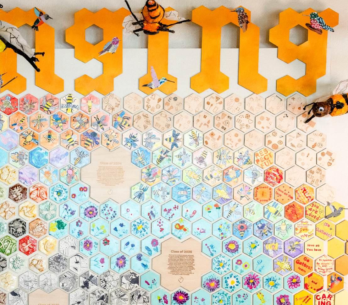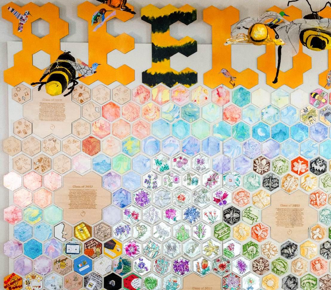 During the 2023-24 academic year, students from Preschool—Grade 8 at SHS, along with faculty and staff, participated in a school-wide art project that reflected the year’s theme of "belonging." The resulting collaboration, titled "Beelonging," was made by combining hundreds of artful hexagon-shaped tiles made by each community member.