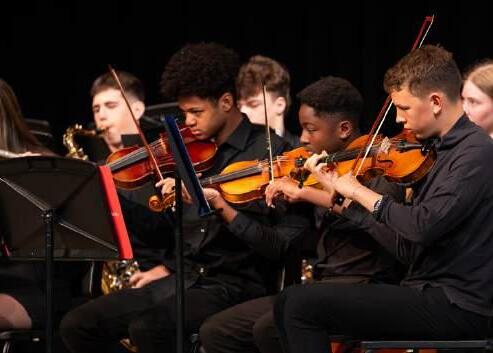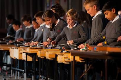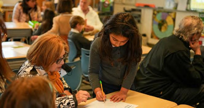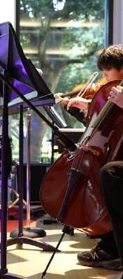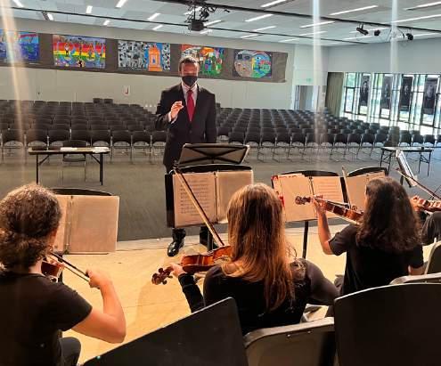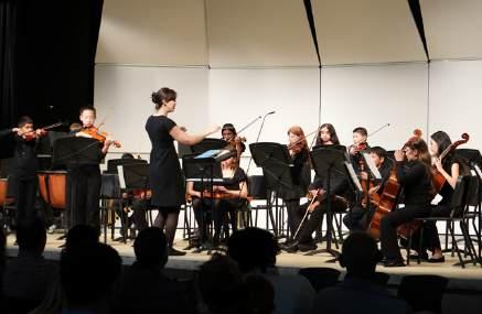 Begun in 2018, Festival Vivace! is a newer Middle School tradition on campus that allows students to experience performance adjudication and workshops led by professional musicians. The festival is brimming with listening opportunities, clinics from guest conductors, and performances by all sixth through eighth grade ensembles. Each discipline—chorus, band, and strings—performed one to two pieces that were adjudicated with a formal rubric, and then experienced a workshop led by one of the three visiting clinicians. Pictured, Atiba Starr, a Bay Area-based bassist and music educator, led a workshop for the Middle School string orchestra.