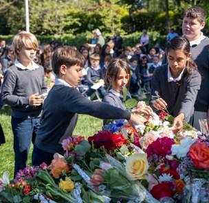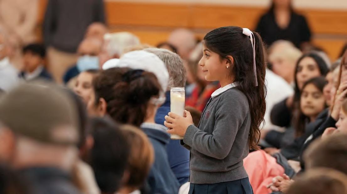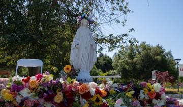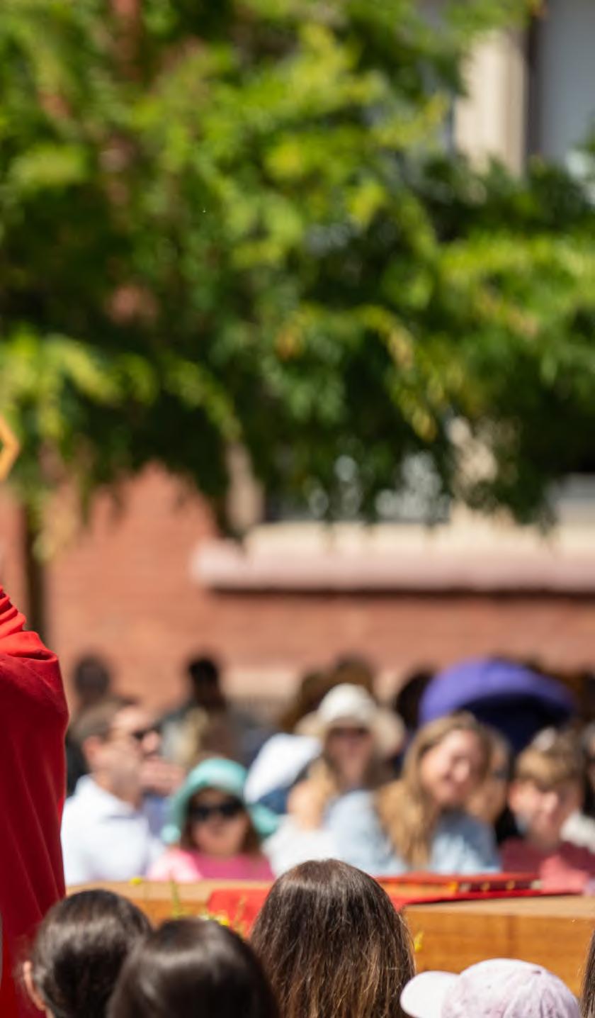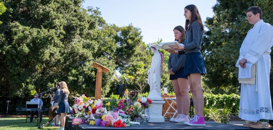 Preschoolers through eighth graders laid flowers around the statue of the Blessed Virgin at the annual May Crowning Ceremony, a decades-long tradition at SHS. Students honored Mother Mary through music, reflection, and a prayer service.