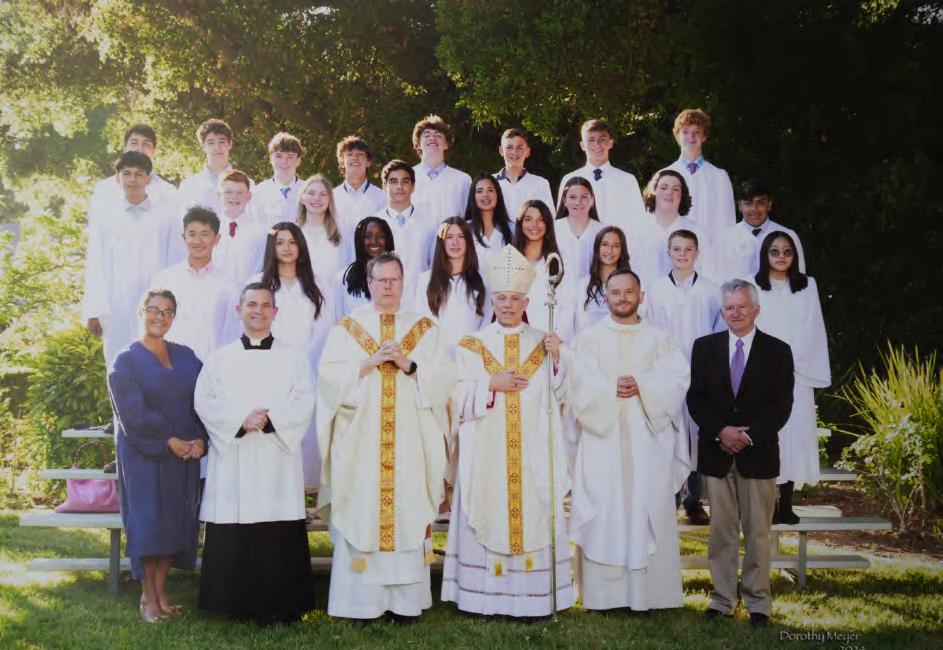 For several years, St. Raymond’s Catholic Parish has generously worked with Sacred Heart to allow our Catholic eighth-grade students to receive the Sacrament of Confirmation as part of their parish community. The group of confirmands is pictured here with St. Raymond’s clergy, Archbishop Salvatore Cordileone of the San Francisco Diocese (front row, third from right), P-8 Principal Francesca Brake (front left), and eighth grade Religious Studies teacher Chris Kanelopoulos (front right). The Confirmation Mass took place at St. Raymond’s on April 27.