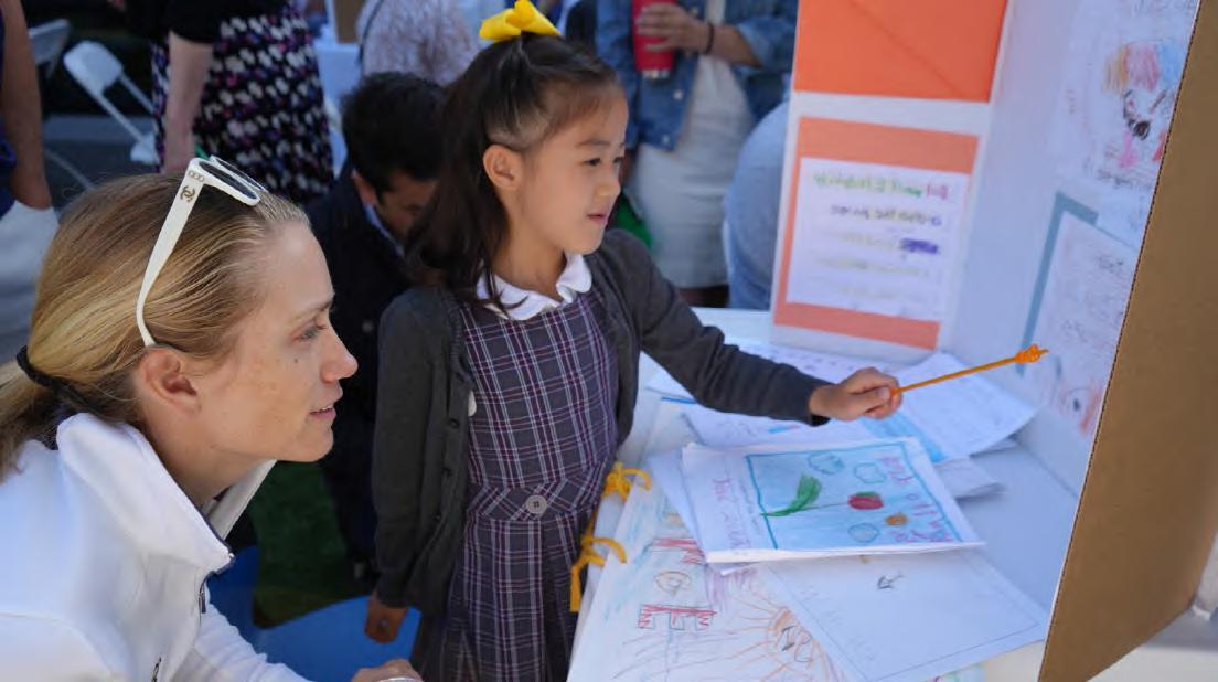 The writing curriculum in kindergarten leads students through an authentic writing process of brainstorming, drafting, editing, and publishing, and covers several genres of writing, from observational writing and personal narrative to “all about” books, poetry, and more. They finish the year with persuasive writing marked by a fun and festive annual tradition—a publishing showcase held on the kindergarten front patio. During the event, each student has a chance to share their persuasive writing about a “world problem” that they know about, such as littering, air pollution, or an endangered animal, to name just a few. Students work for several weeks creating signs, songs, letters, petitions, and finally, a speech about their selected world problem. Parents, guardians, faculty and staff—and even visiting RSCJ—are invited to attend. Visitors cycle through the stations to meet with each child to hear their presentations. Pointer in hand, the children animatedly share their colorful, illustrated writing samples, like a conductor ushering in the crescendo with aplomb. Along with their persuasive writing unit work, the displays feature writing samples from throughout the year, August to May. The writerly bunch experience pride in sharing the progress they’ve made not just with their own parents, but with their friends’ parents, and many educators from across the Lower & Middle School campus. Among the feedback kindergarten teacher Whitney Infelise received included the remark that the event perfectly encapsulated Sacred Heart’s Goal III: A social awareness which impels to action. “I thought that was a nice way to think of it,” she said.